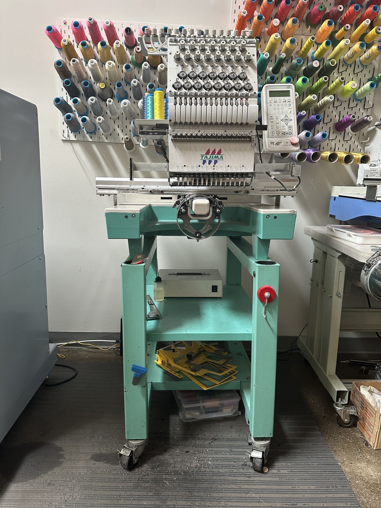 Tajima Embroidery Machine 15 needle single head. Recently serviced by technician. Includes cap frame + 2 cap clamps. Comes with several different hoop sizes + hooptech frames for shoes, belts, etc. Includes magnetic hoop Works great, easy to use.