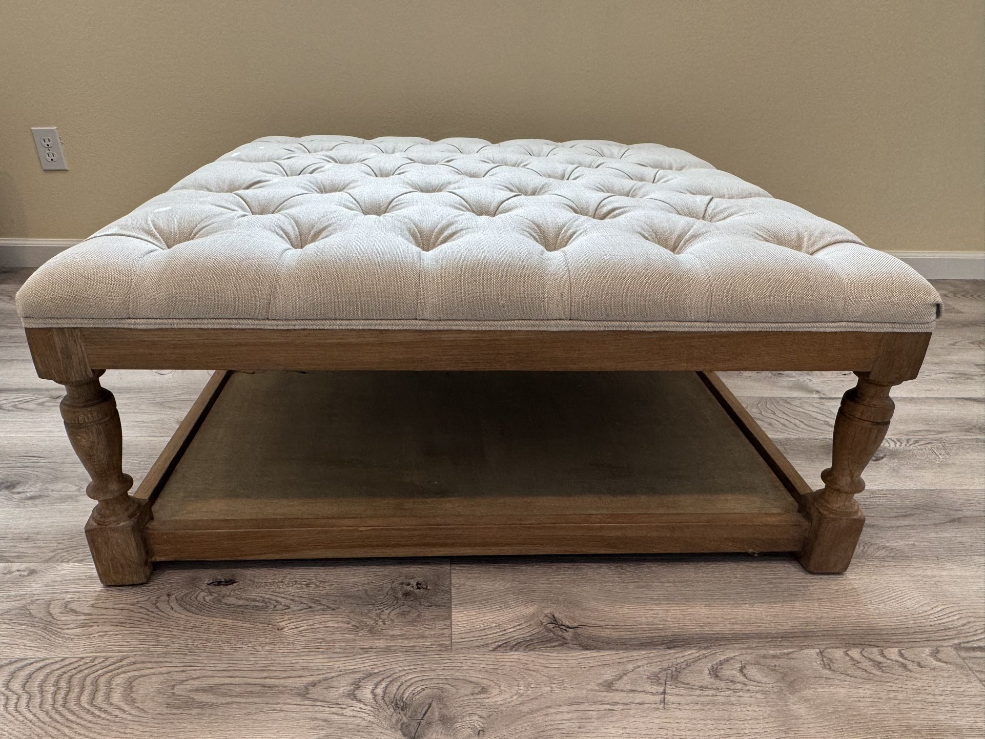 Classic Beige Linen Upholstered Tufted Wood Ottoman Coffee Table 17.75 inches high x 39.5 inches wide x 39.5 inches deep Between legs: 34.5 inches; Shelf opening; 9 inches high Constructed from solid ash wood Finished in natural grey Upholstered in beige fabric. Fabric content: 50% linen and 50% polyester Features solid ash wood turned legs and storage shelf https://offerup.com/redirect/?o=aHR0cHM6Ly93d3cua2F0aHlrdW9ob21lLmNvbS9Qcm9kdWN0L0RldGFpbC83ODkzMC1BbGVhLU1vZGVybi1DbGFzc2ljLUJlaWdlLUxpbmVuLVVwaG9sc3RlcmVkLVR1ZnRlZC1Xb29kLU90dG9tYW4tQ29mZmVlLVRhYmxl (this version doesn’t have nailhead detail).
