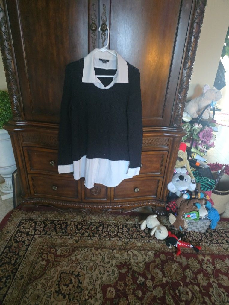 Size large black sweayer with silk colorand white shirt very elegant for holiday church, work not using come get