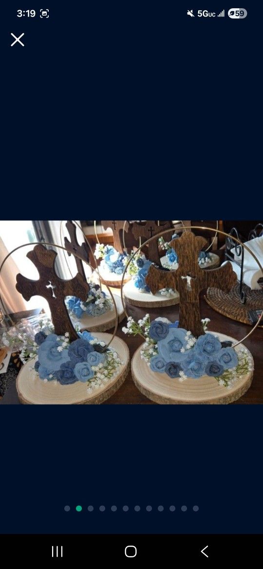 10 cross centerpieces all wood 3 candle centerpieces 9 table runners Full box of floral and ribbon 2 gold rings to make centerpiece 3 remote control candles 1 candle ring that hangs Everything is in the pictures..