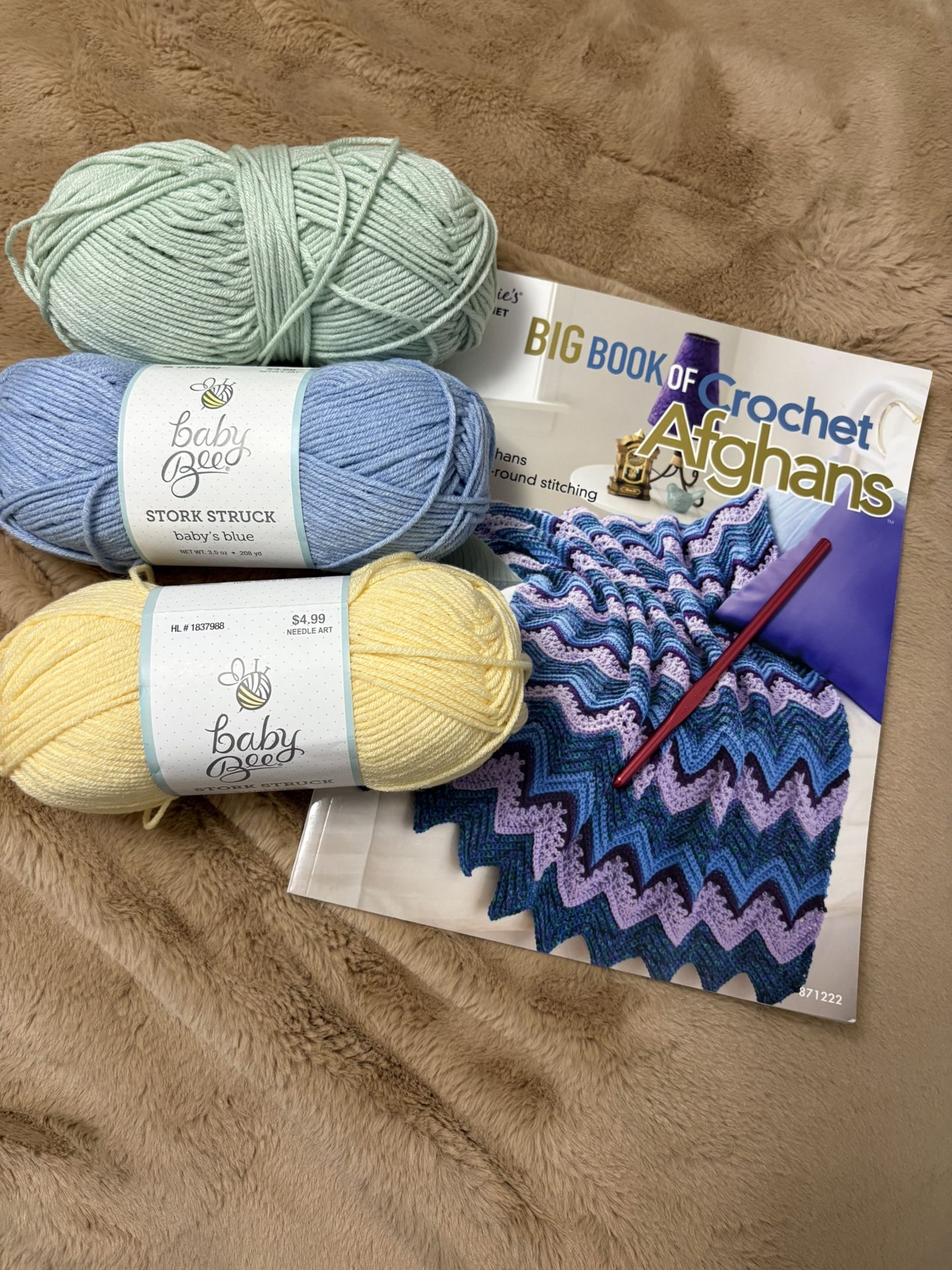 Three skeins of Baby Bee yarn. Acrylic/Tencel blend. 5.5 MM crochet hook and book with afghan design instructions.