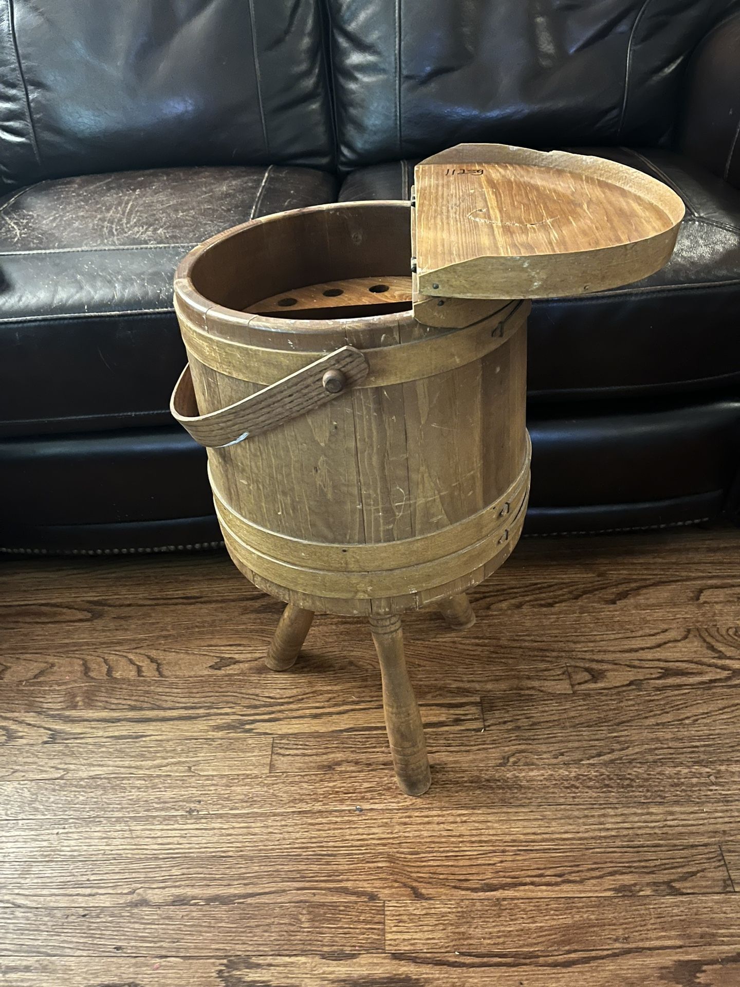 vintage wooden firkin-style sewing bucket with tripod legs