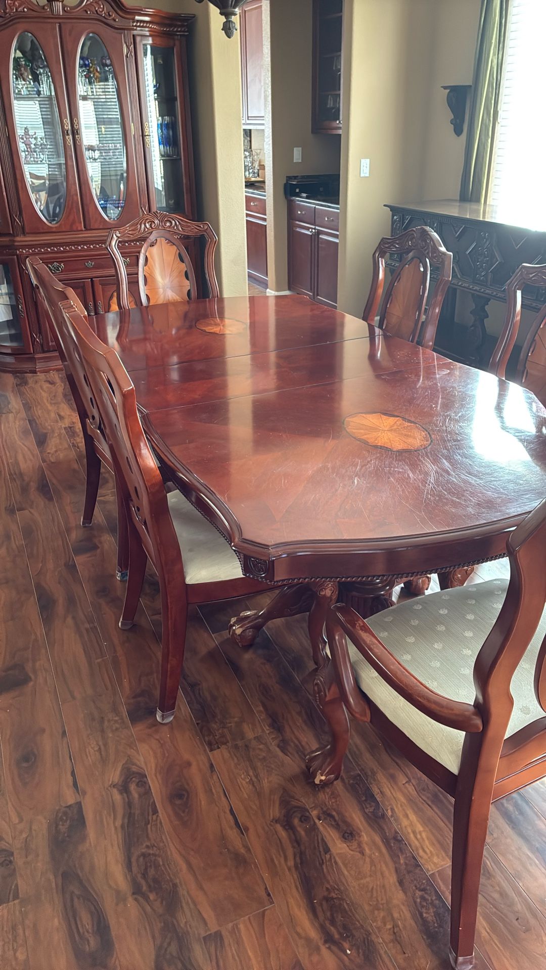 Table has 2 leaves and 8 chairs cabinet is in excellent condition . Make an offer