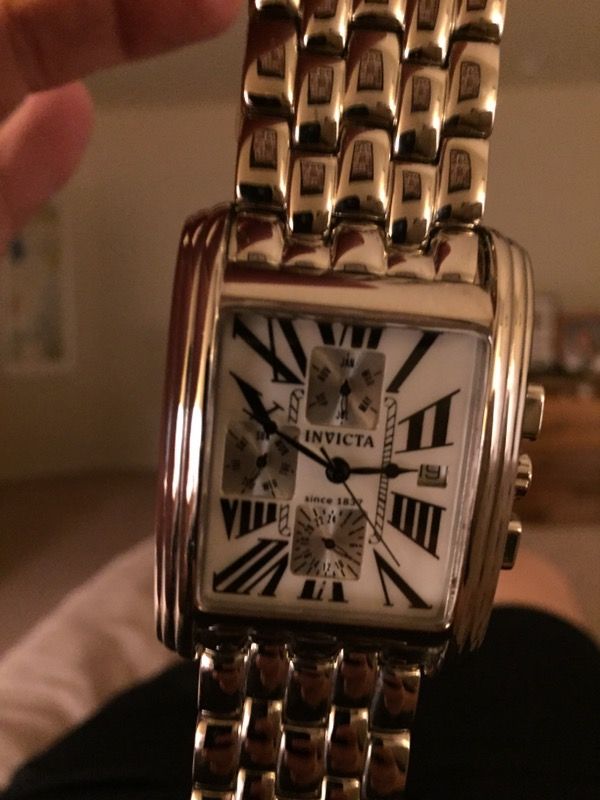 Beautiful Invicta stainless steel chronograph watch Pearl face Date function water resistant deployment clasp engraved back comes with display box. Needs a battery. All sales final.