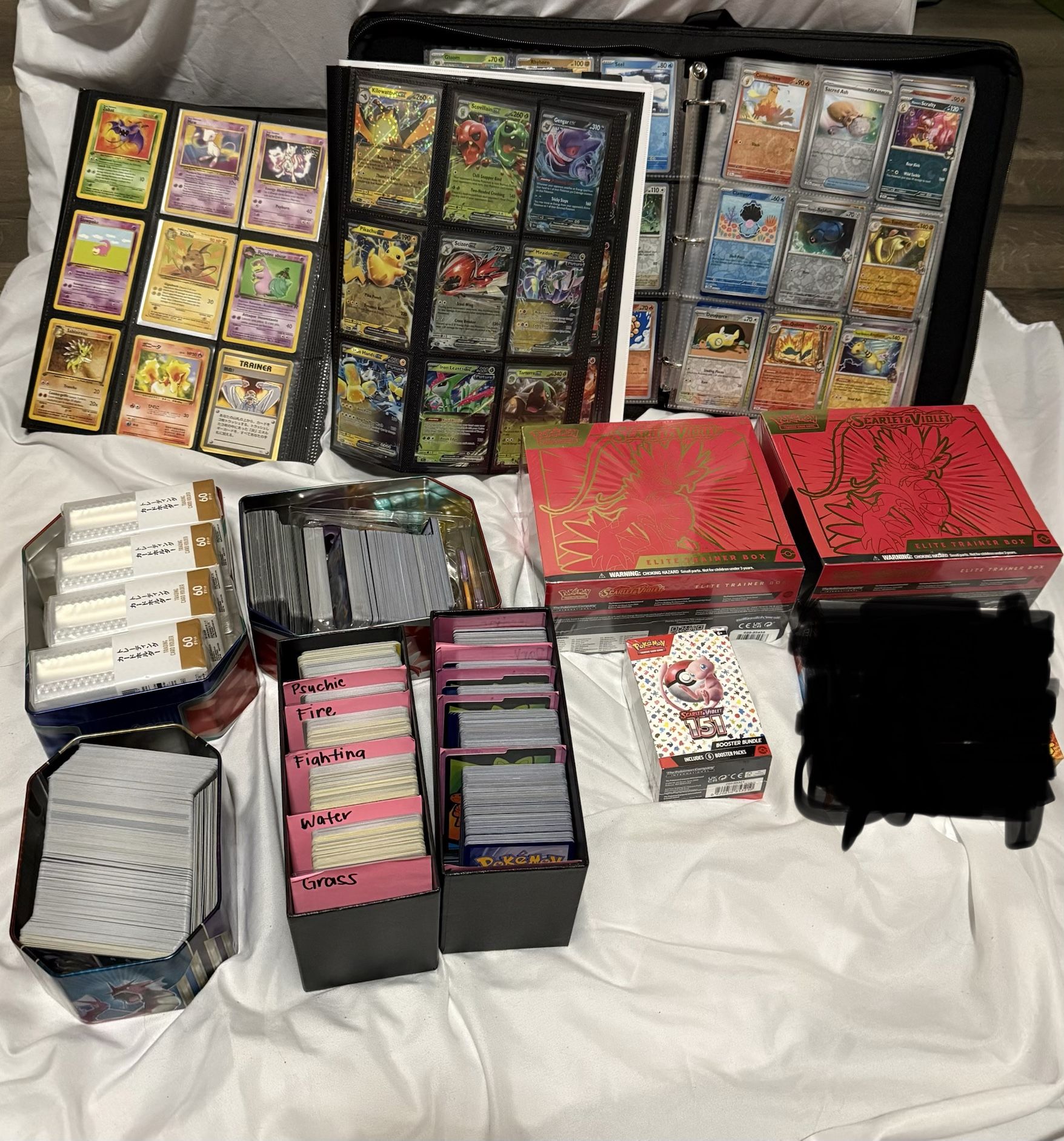 Selling some of my collection. Must sell all together. Binder 1 306 reverse/holo cards include the binder Binder 2 200 ex cards 12 v cards 2 holo full art 20 ace spec cards Total of 234 cards include prismatic binder Binder 3 Over 320 cards of vintage cards 2 etb and 1 tin full of non holos modern cards 1 tin are just non holo energy cards and code cards 4 sealed mini binder trading cards holder Sealed products: 2 scarlet & violet etb 1 151 booster bundle