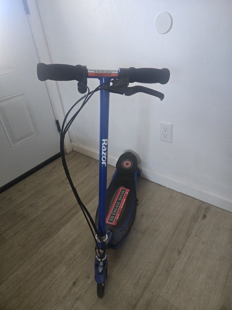 Blue electric Razor Scooter. For ages 8 and up. Includes charger. Works great. My son is just too scared to ride it.