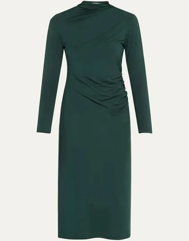 This item is a Vince Long-Sleeve Ruched Turtleneck Midi Dress in a juniper or evergreen hue. It is crafted from a comfortable stretch jersey fabric, typically a blend of rayon and spandex, and features elegant ruching details at the neckline and side hip.