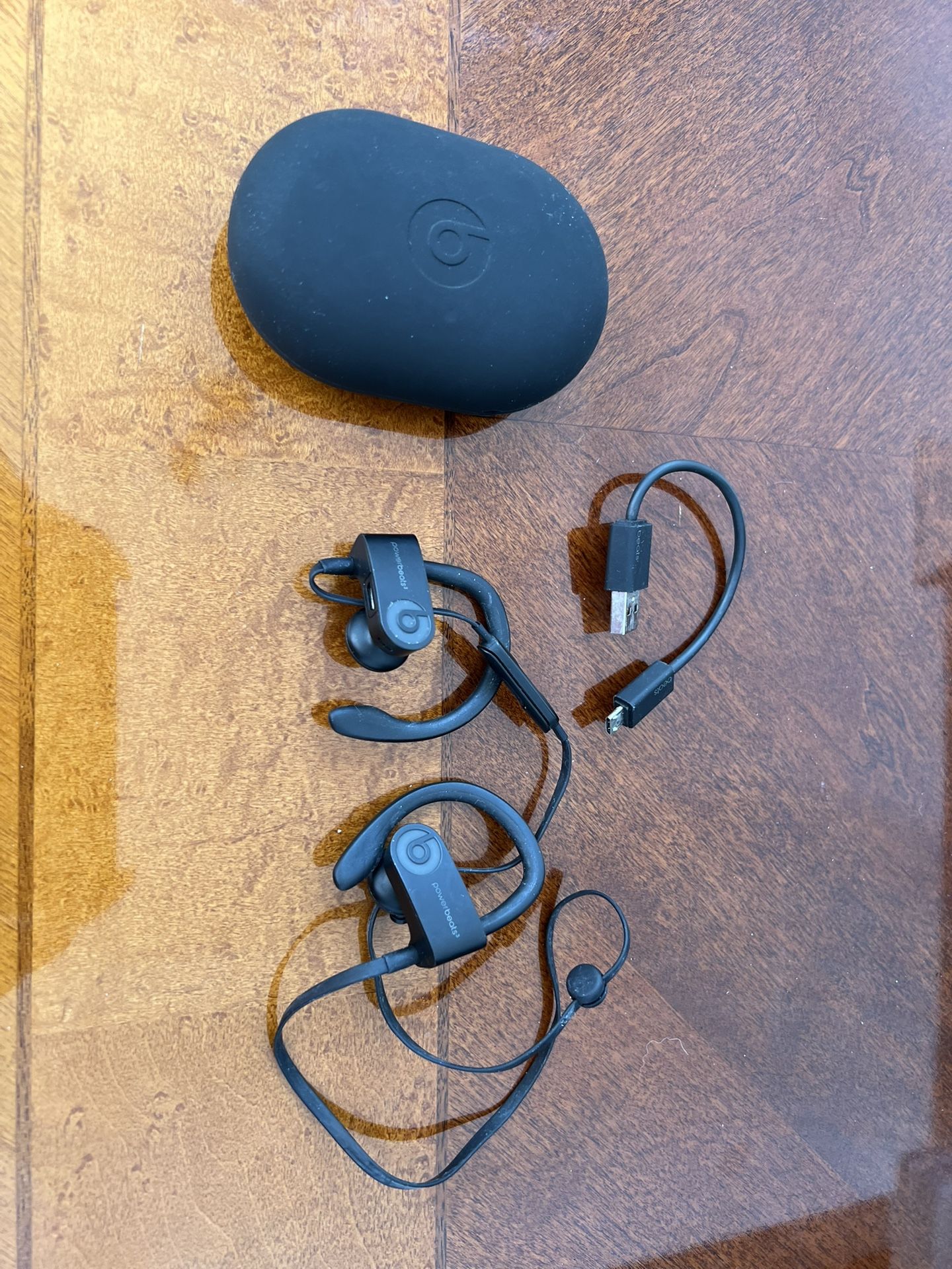 Power Beats (no ear cushions for sanitary purposes). Wireless Bluetooth connect, great sound with noise cancellation.