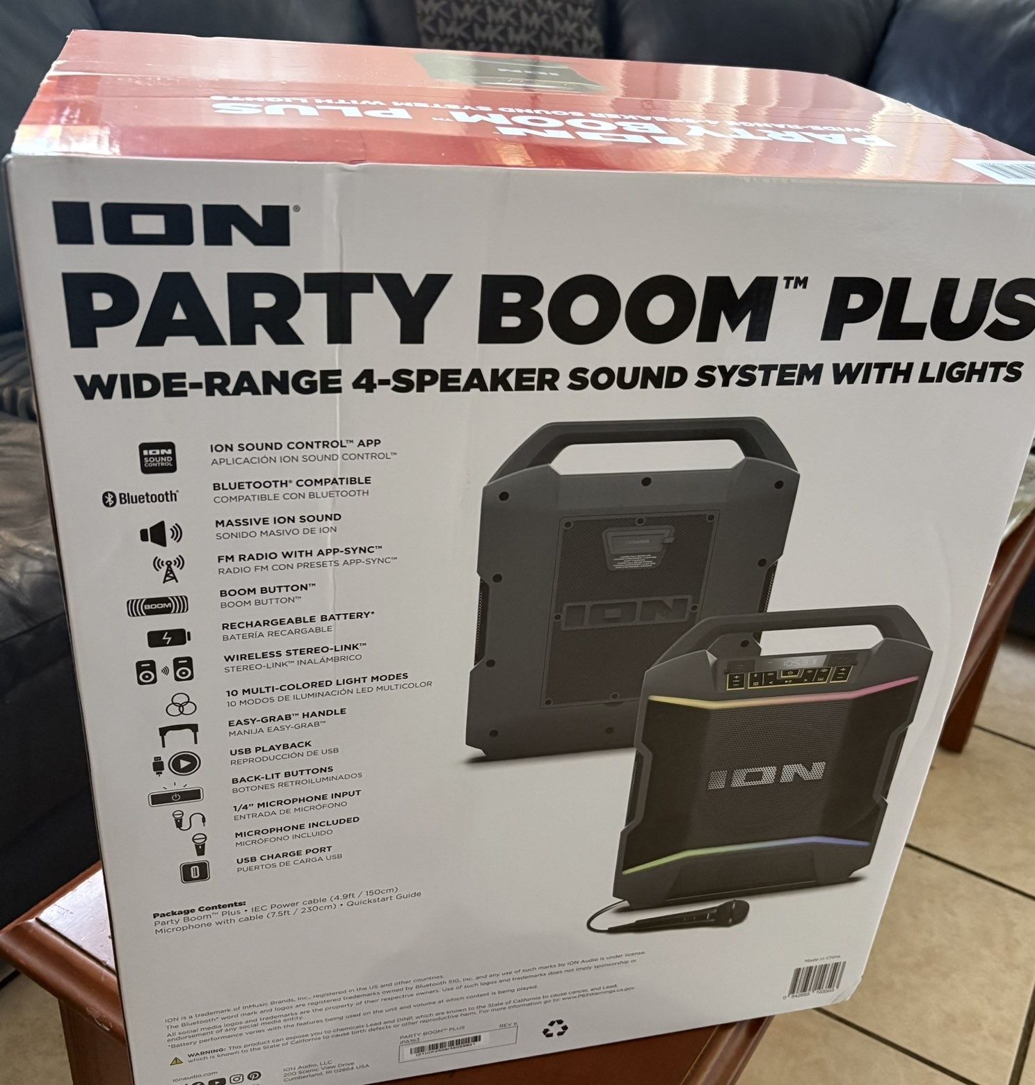 Brand New Still In Box! ION PARTY BOOM" PLUS WIDE-RANGE 4-SPEAKER SOUND SYSTEM WITH LIGHTS ION SOUND CONTROL™ APP BLUETOOTH• FM RADIO WITH APP-SYNC™ BOOM BUTTON™ RECHARGEABLE BATTERY• WIRELESS STEREO-LINK™ 10 MULTI-COLORED LIGHT MODES EASY-GRAB™™ HANDLE USB PLAYBACK BACK-LIT BUTTONS 1/4" MICROPHONE INPUT MICROPHONE INCLUDED USB CHARGE $110