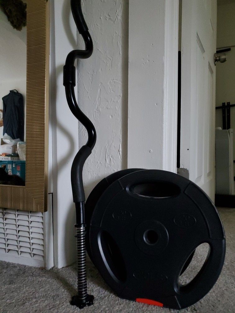 Removable 20 lb plates on a Curl bar. 40 pounds all together. Curl bar may be 4 or 5 pounds