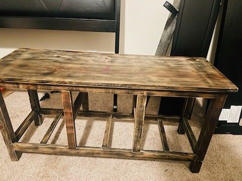 Long wooden sofa or console table. 42 long x 15 wide x 21 high Some staining on top. Can be sanded, painted, restained, covered with a runner or a vase which is what we did. This is a solid table.