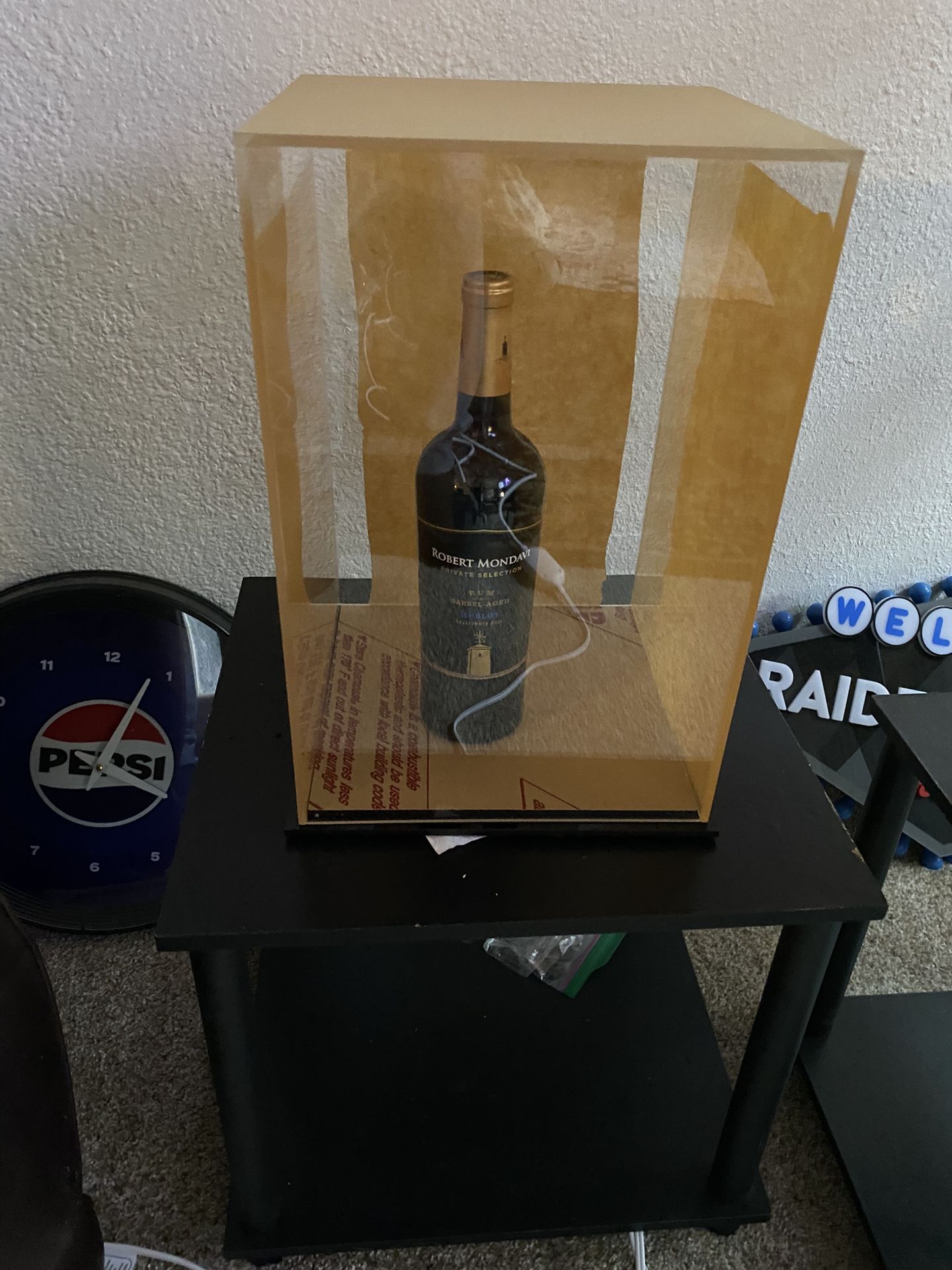 Acrylic display 10x10x15 tall $30 black base (Wine bottle not included .for display purpose only)the brown is paper masking to prevent scratches before displaying Glove box holder wall mount. Hold 3 boxes $30 Mini football helmet display $20,,, 4 available