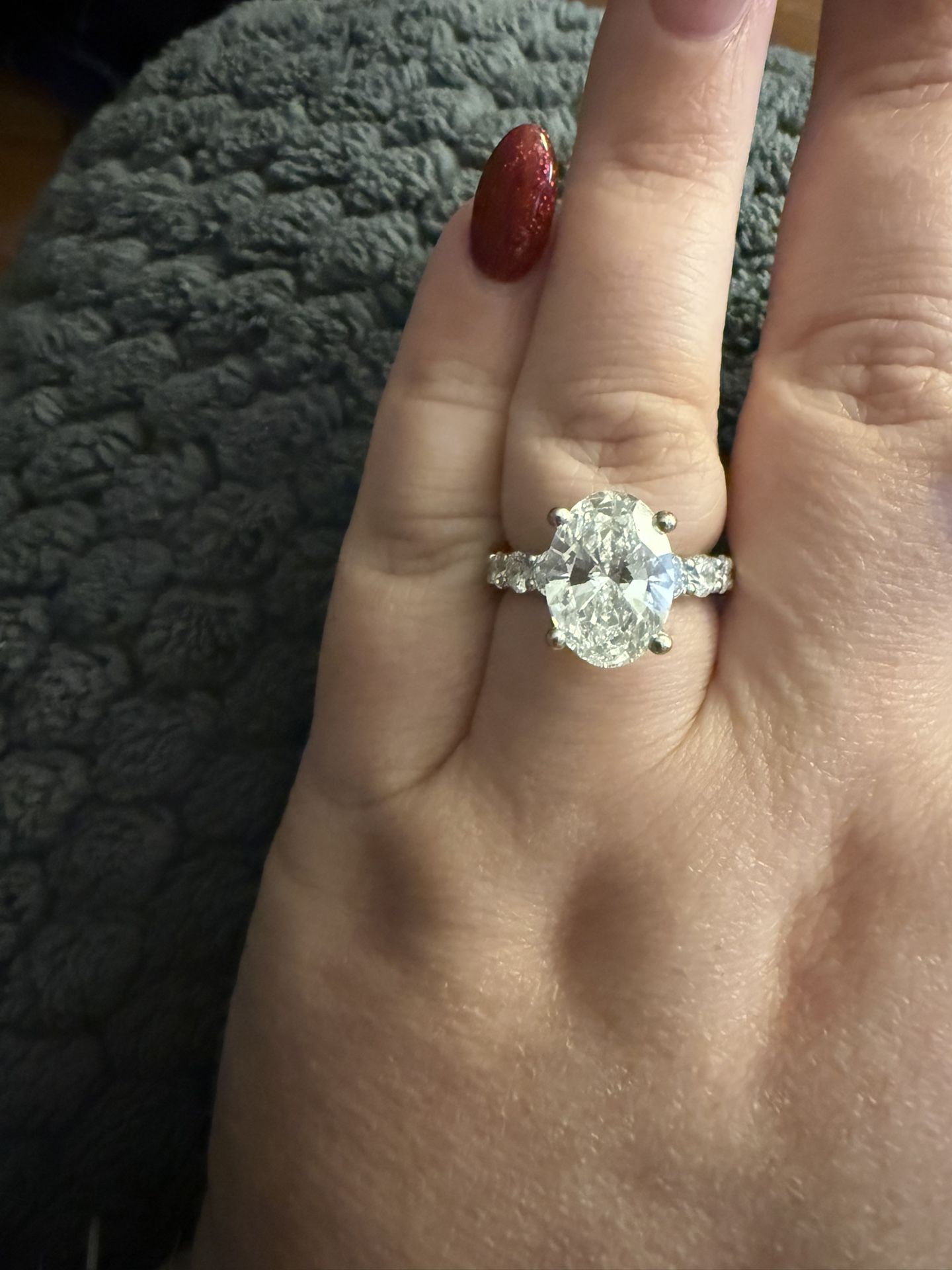 Beautiful 5kt F VS engagement ring in white gold. My loss is your gain. Absolutely stunning in person. Size 7 and can be resized. Posted a video showing the diamond being tested on diamond tester. Let me know if you have any questions. Thank you for your interest!