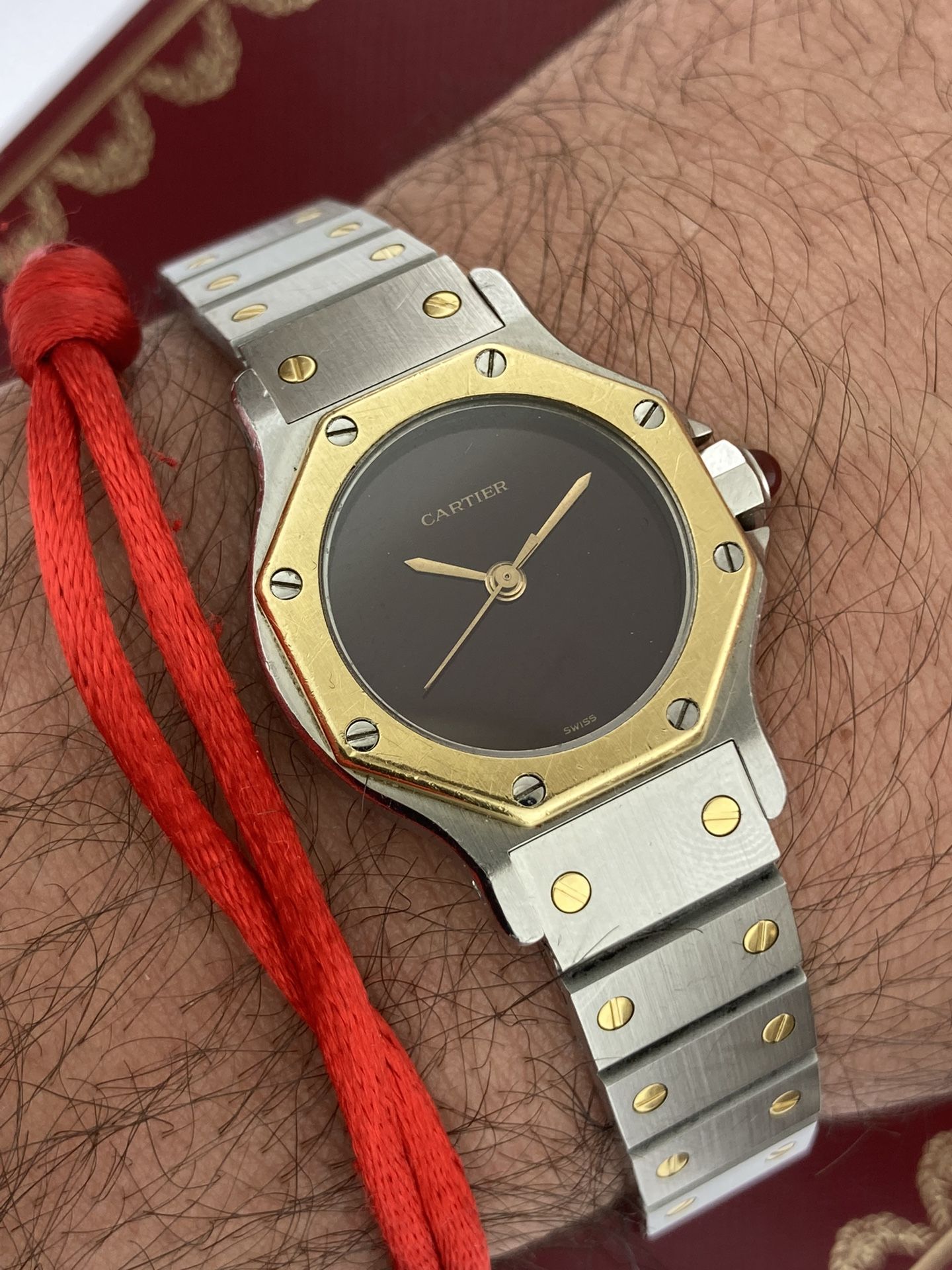 Silver-tone stainless steel case with a two-tone (silver-tone and yellow gold-tone) 18kt yellow gold and stainless steel bracelet. Fixed yellow gold-tone 18kt yellow gold bezel. Red dial with yellow gold-tone hands. Dial Type: Analog. Automatic movement. Scratch resistant sapphire crystal. Cabochon crown. Solid case back. Octagon case shape, case size: 24 mm. Fold over clasp with a safety release. Functions: hour, minute, second. Santos Octagon Series. Dress watch style. Watch label: Swiss Made. Pre-owned Cartier Santos Octagon Automatic Red Dial Ladies Watch 0907. 23w 47th 2nd Fl New York NY 10036 Cell: 917 —— 709 —-6142