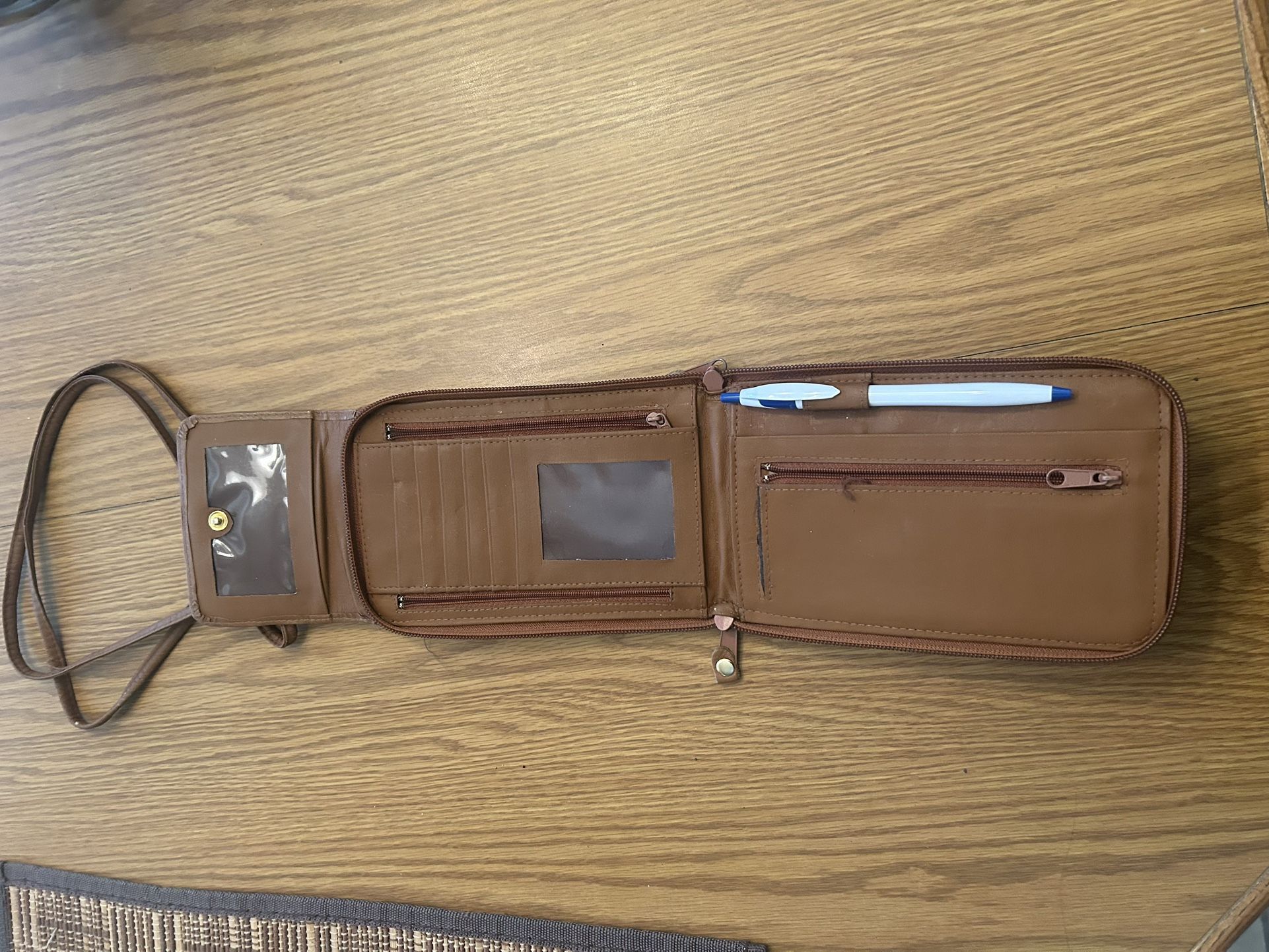 Crossbody leather wallet and passport holder with detachable strap and full zipper closure for safety.