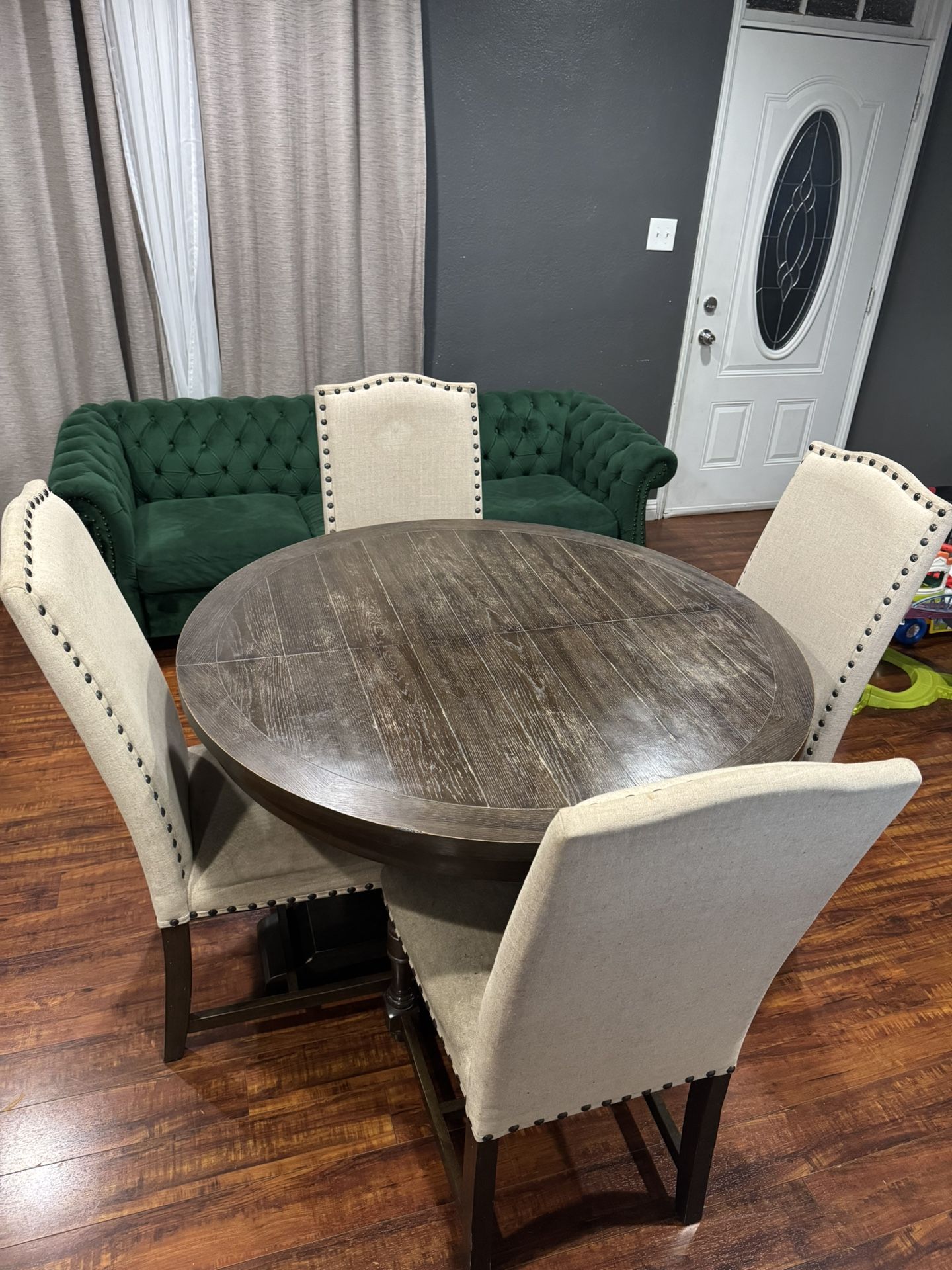 Beautiful table and chairs. 4 chairs. Measurements in the pictures. Nothing wrong with the table. The chairs do need some cleaning my kids got them dirty. Pick up only in Fontana. Comes with leaf extension