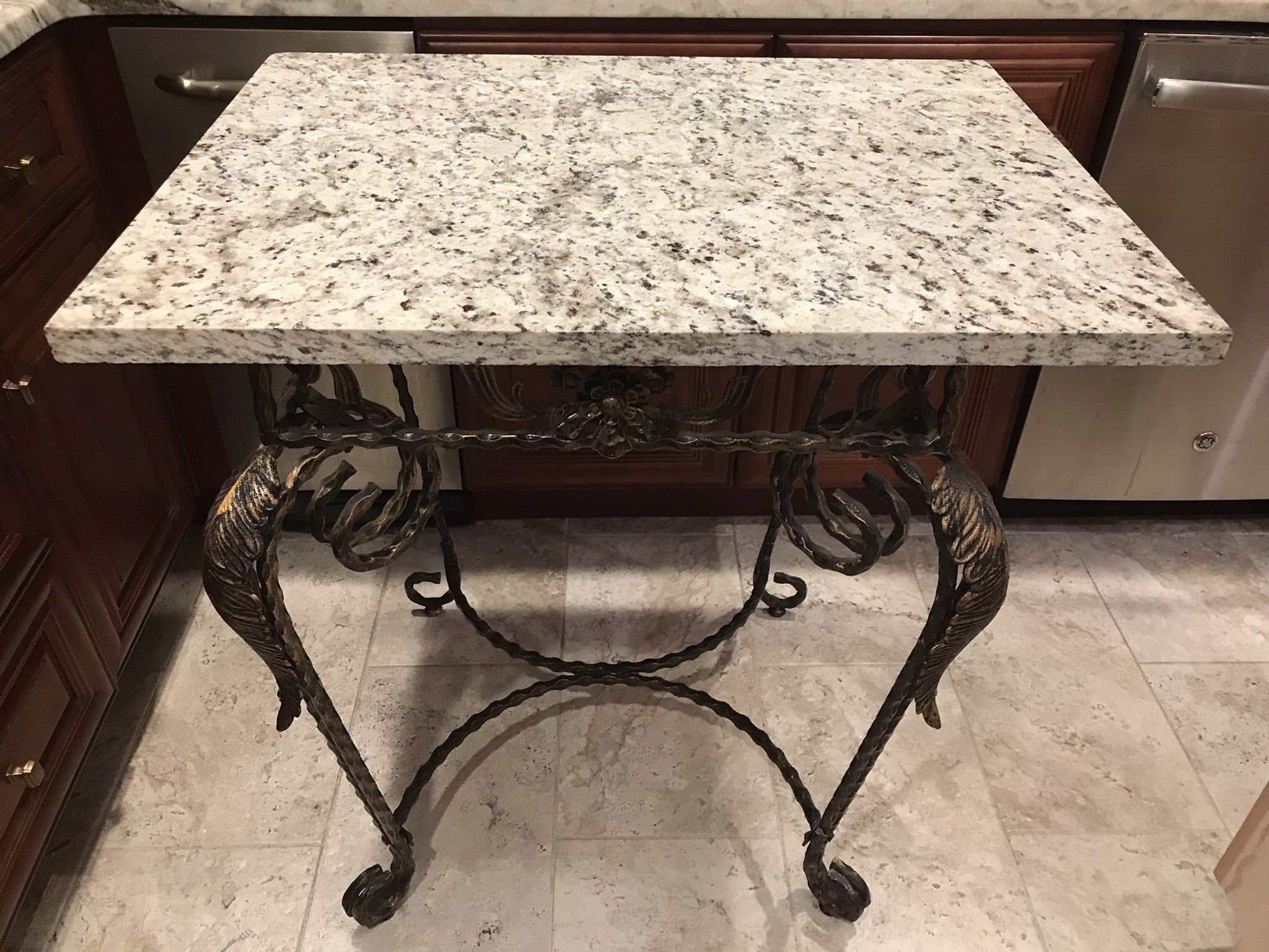 Granite slab, white with gray, black and silver specs. 34“ x 25 3/8“. Size compatible with French style wrought iron table shown in photos. Table is not included, it’s being sold in my other post.