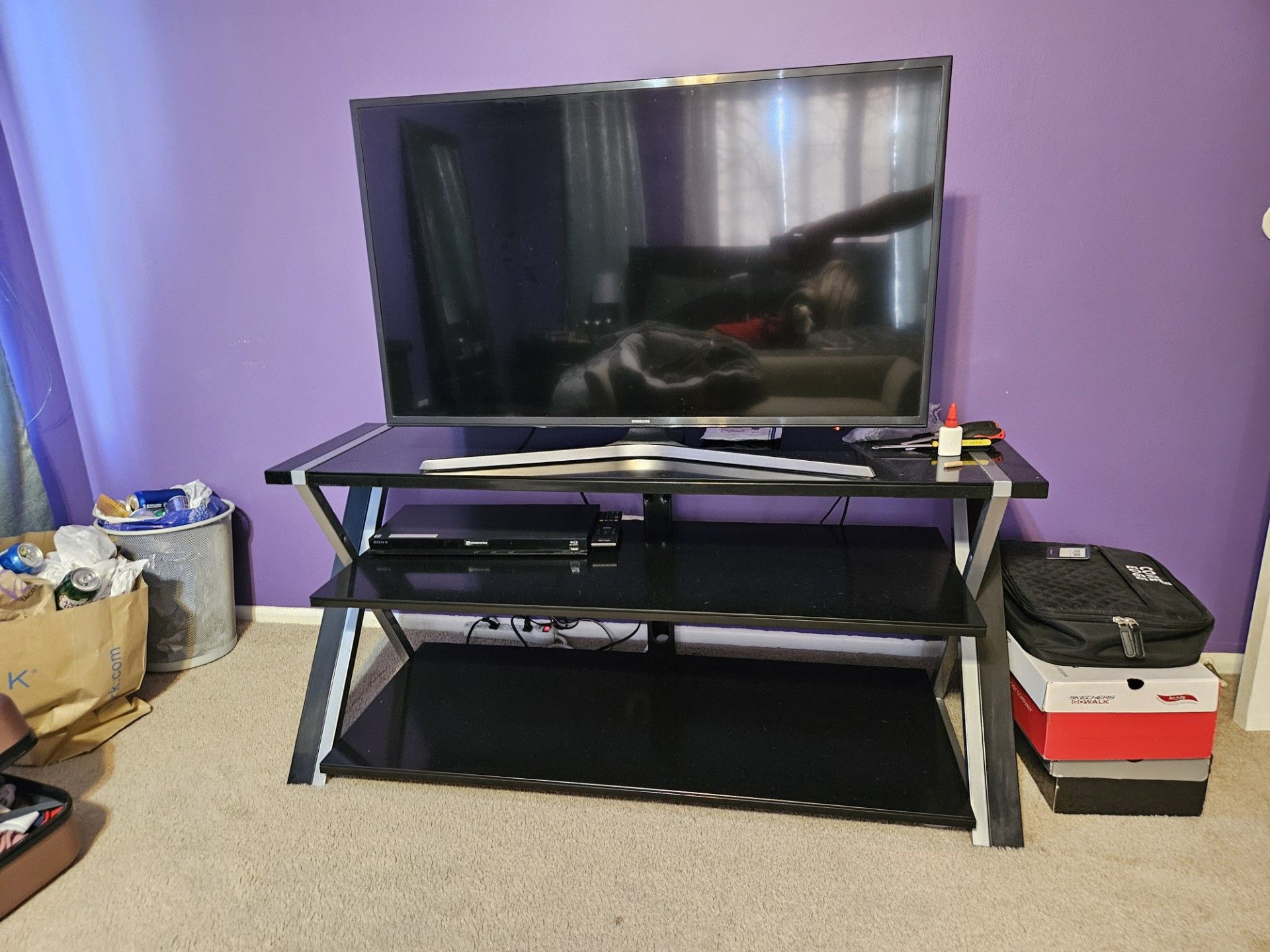 I have used condition TV stand for sale * Fits 40 inch-65 inch TV's * Material: Glass and Metal ( TV shown in picture is 40 inch ) Price Negotiable Local Buyers Only Pickup Only Cash Only No Shipping