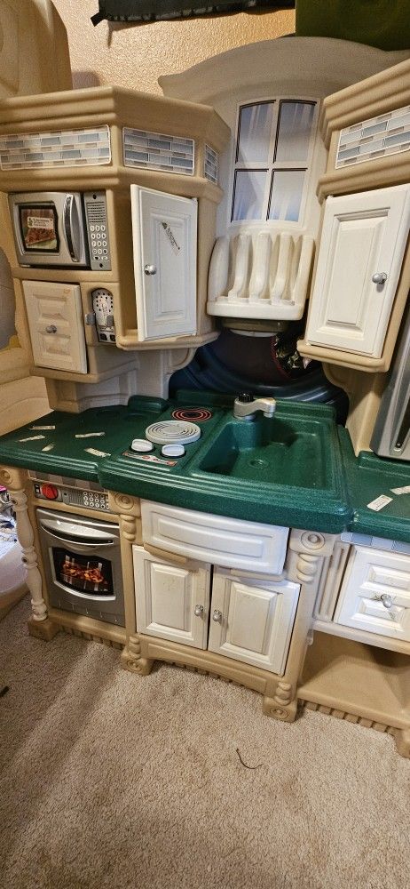 Good condition light and sounds, cashier machine and a one big bag the food, plates, cups, pots, fruit, vegetables, etc.....