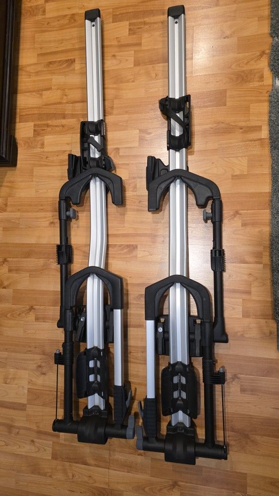 A pair of Thule UpRide bike racks in excellent condition. All matching locks with 2 keys. T-bolt mounts for Thule WingBar Evo. Extra mounting hardware for square bars rails.