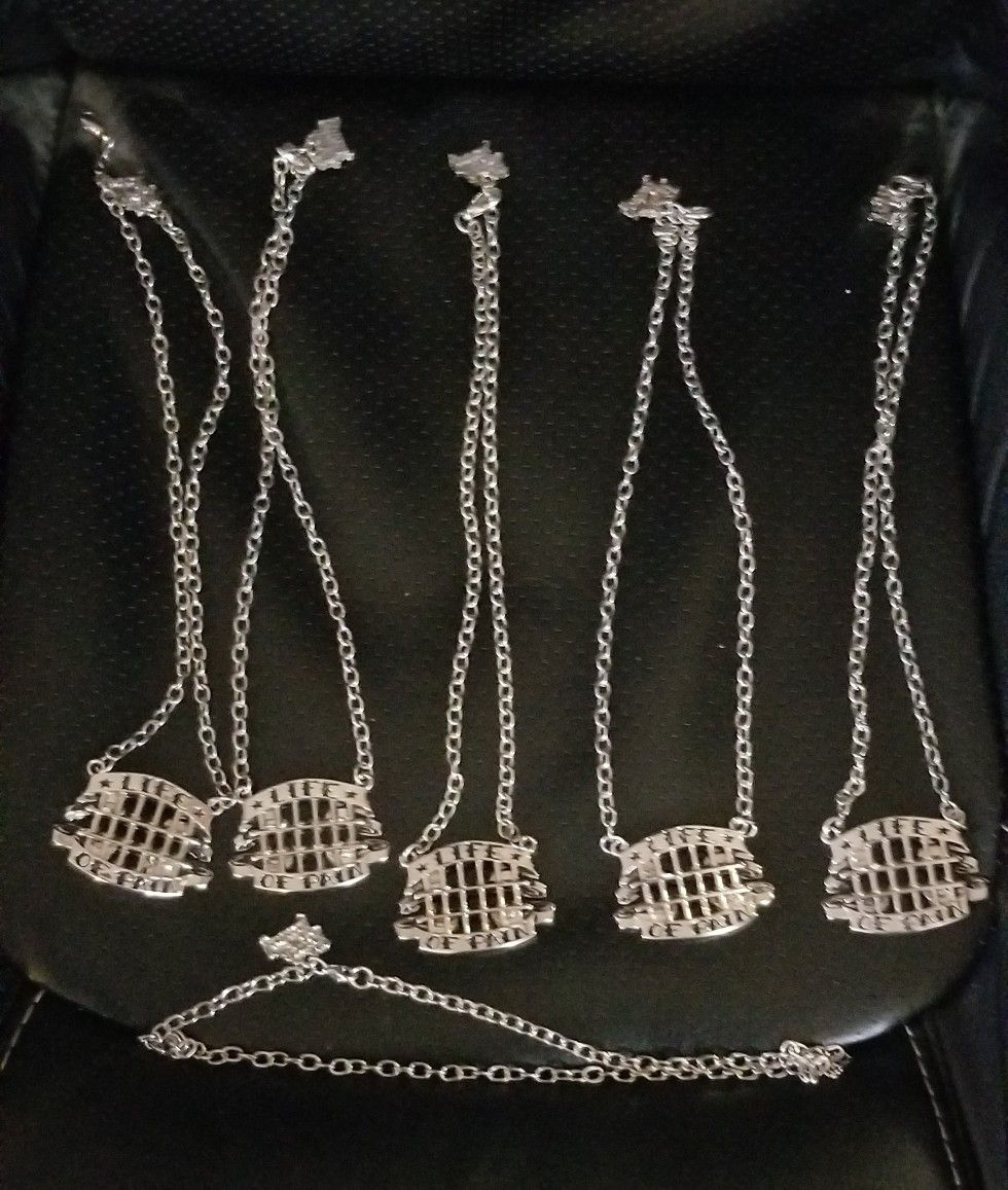 New5 necklaces 20.00 each that say Rock Rebel , they make great christmas presents for a group of friends , or i dividual,make me an offer they have a piece that says Rock Rebel and says life is pain on the necklaces. 99..00 for all 5 that are lined up up top of picture only