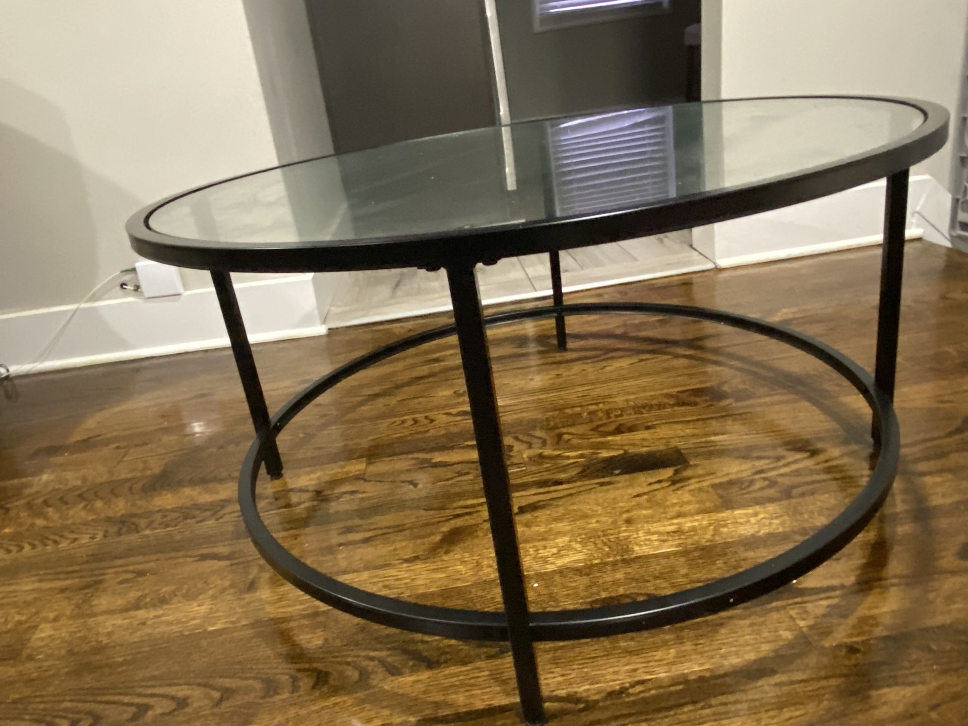 Glass coffee table with metal frame. In good condition, no cracks in the glass ,Very clean and sturdy. Pickup only.