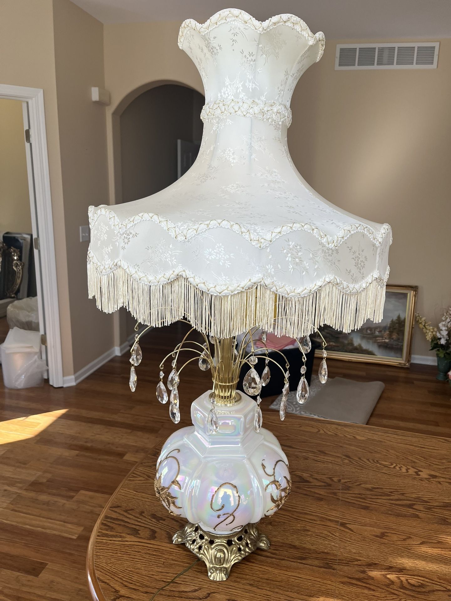 Two Antique Lamp Set w Hanging Crystals, opalescent with gold accents.