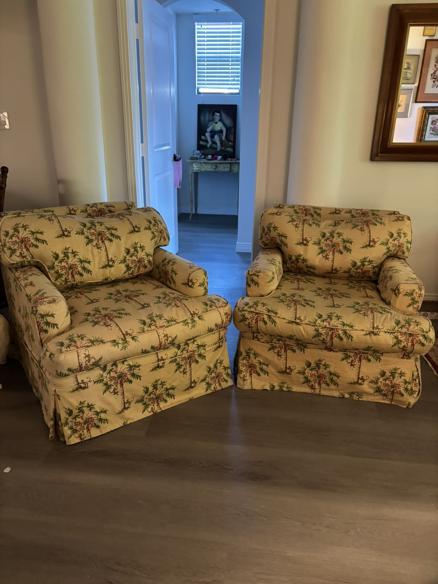 These cute, comfy chairs are free to whomever would like them! In good condition, slipcovers can be taken off/replaced. Easily taken out, chairs have casters (wheels) and building has an elevator