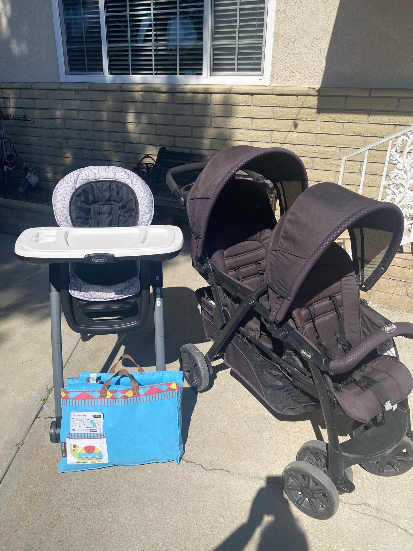 Graco high chair and Chicco double stroller with a tummy time mat that turns into a bag. Willing to separate. Used but in good condition.