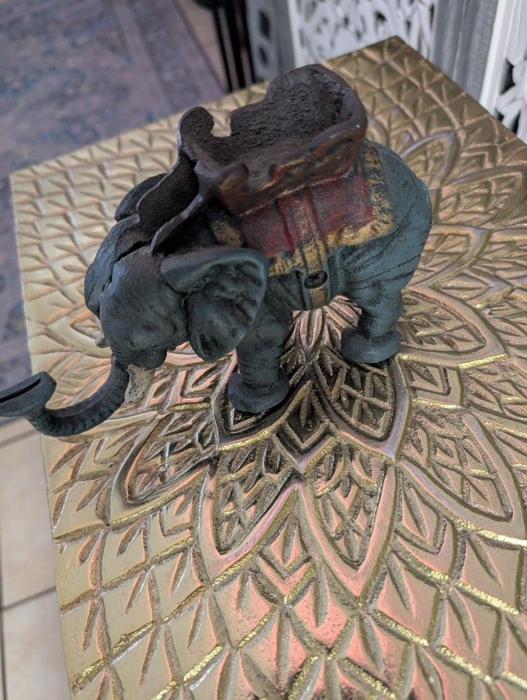 Cute antique elephant bank . Place the coin on the elephants trunk and it deposits the coin . Still works just a cute piece also heavy made of metal