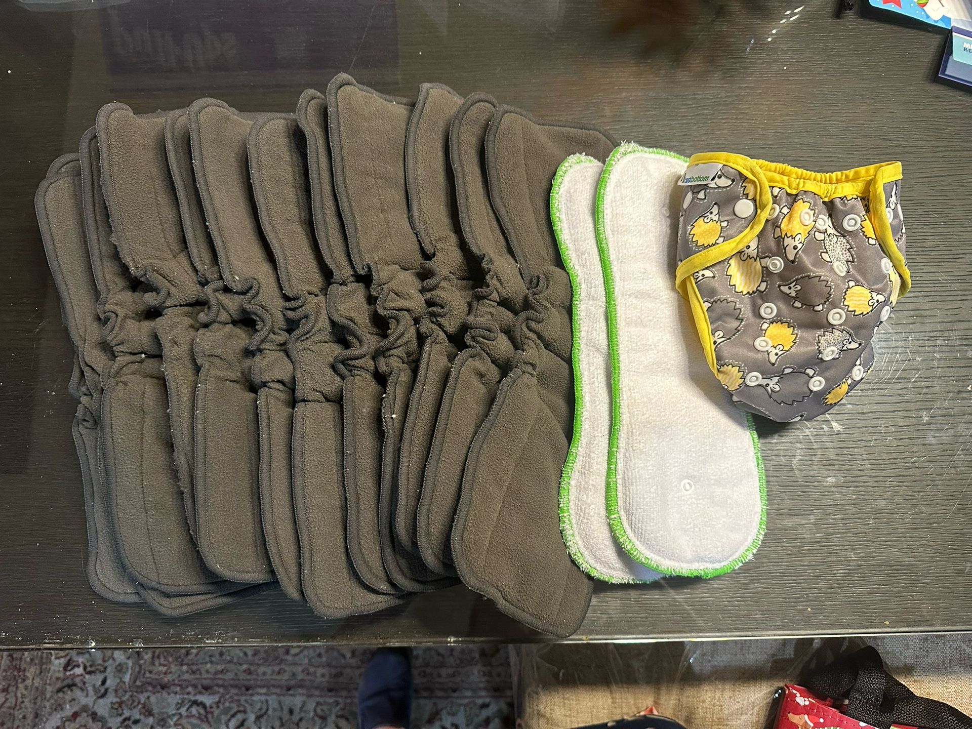14 reusable cloth diaper inserts - two of them have the internal snaps and are white, the rest are just the ones you put inside the diapers. No stains whatsoever - only used a handful of times because I switched to all in ones. The one cloth diaper shell I have is best bottom brand with the inside snaps.