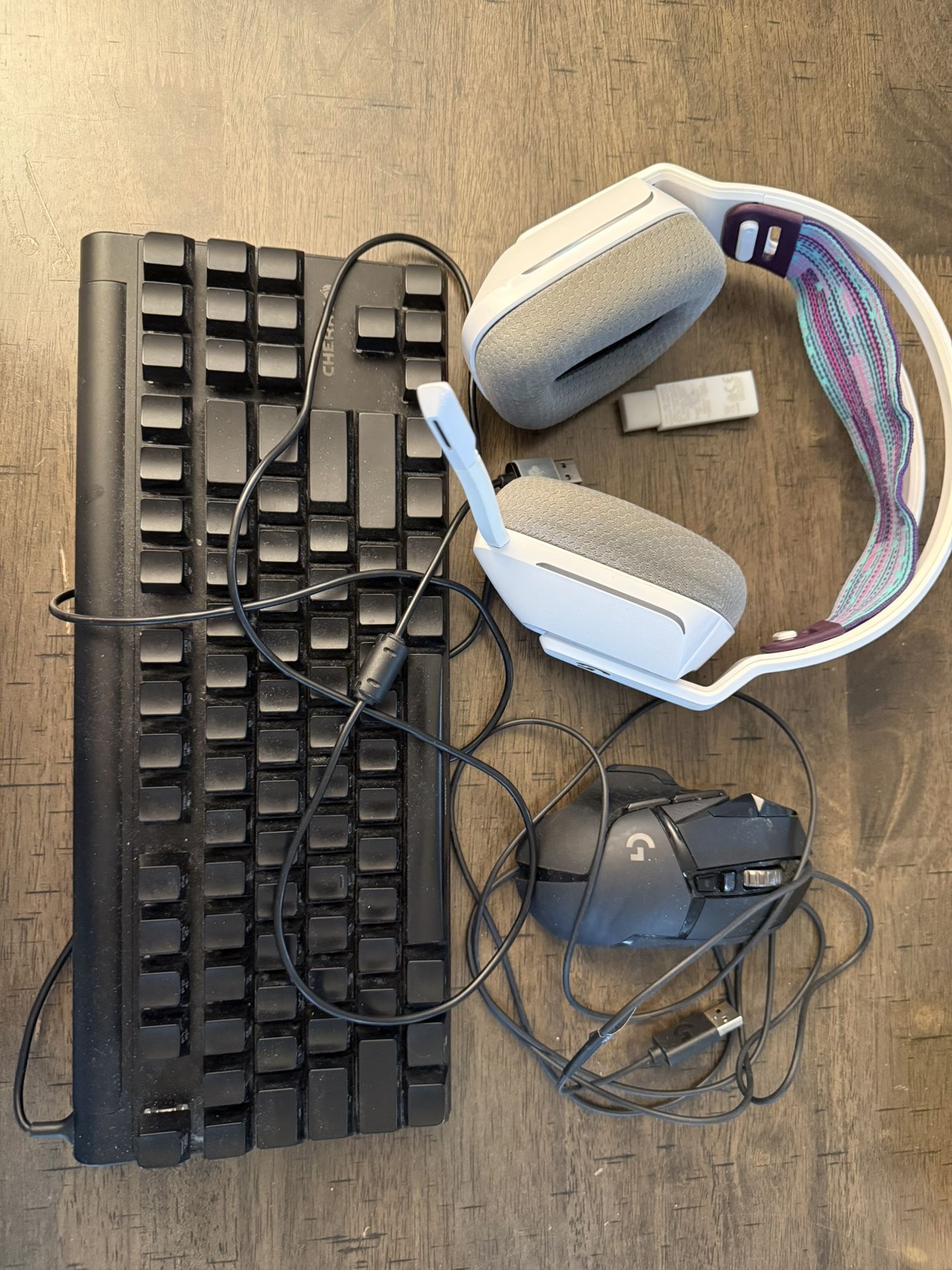 Selling a full gaming peripheral bundle — includes a Cherry MX mechanical keyboard (wired), Logitech gaming mouse with customizable buttons, and a white Logitech wireless gaming headset with cushioned ear pads and colorful strap. • All items are functional • Light dust from storage, can be cleaned up easily • Great value for gamers or anyone needing reliable accessories • USB dongle for headset included