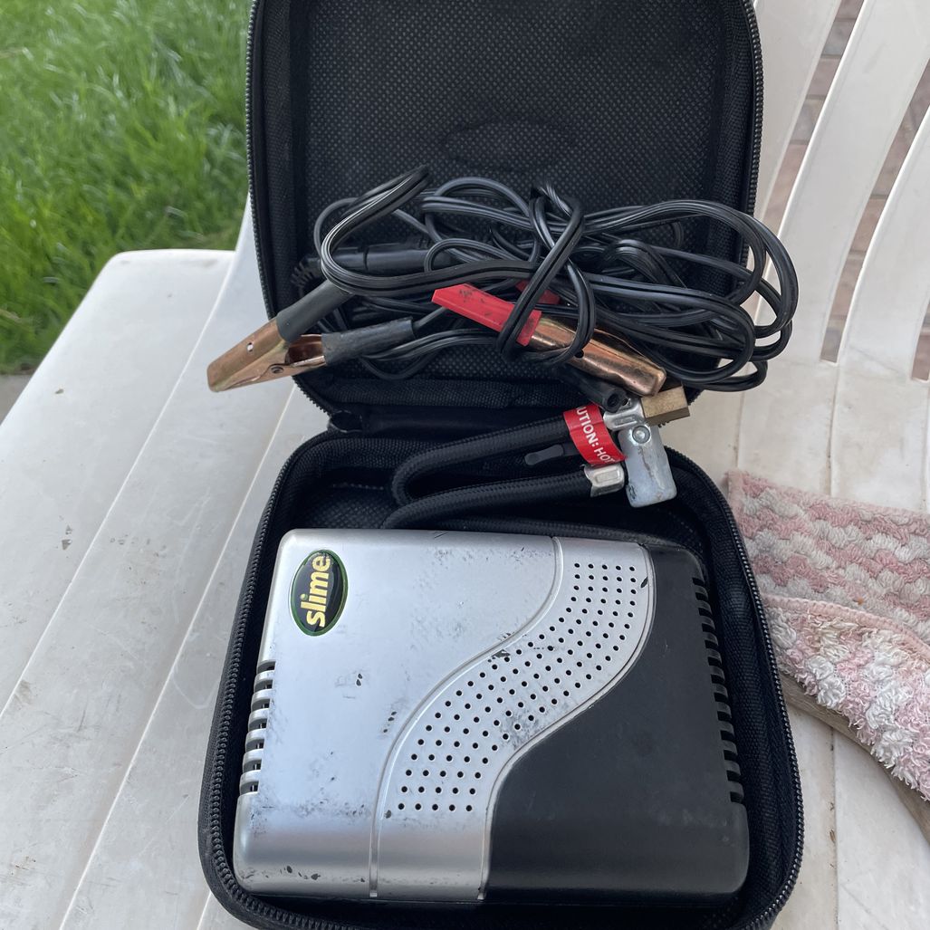 This item is a Slime brand tire inflator, likely part of an emergency roadside kit or a portable inflator set. It is designed for rapid inflation of car, SUV, and truck tires. Some models feature "Inflate-Right Technology," which automatically shuts off the inflator at a preset pressure. These units typically plug into a 12-volt vehicle outlet for power. It includes a built-in air hose and may come with additional adapters for inflatables like balls or rafts.