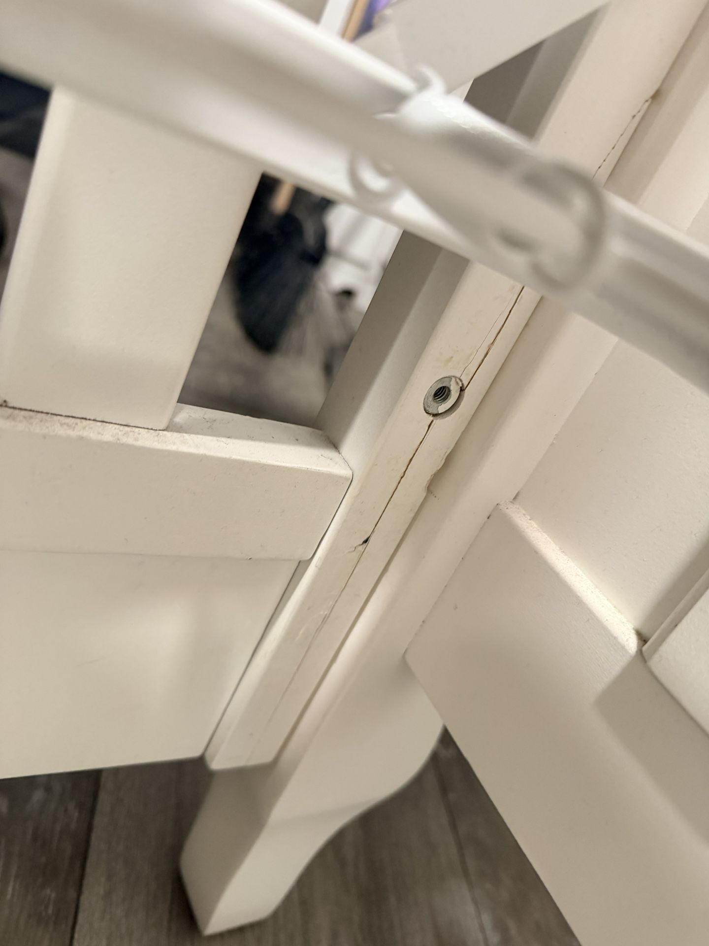 Used baby crib from previous owners never got to use with our kid, beautiful white baby crib with adjustable bed to raise or lower. Wood broke before from moving it from location to location but glued back with wood glue. Still hold weight, will be broken down photos are how looks build perfect for new born