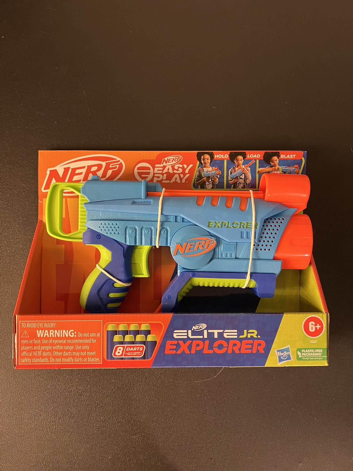 The Hasbro Nerf Gun Easy Play Elite Jr Explorer Blaster is a fun toy for kids aged 6 years and up. With its 8 darts and easy play design, children can enjoy hours of imaginative play outdoors. This blaster, part of the popular NERF brand, is a great way to encourage physical activity and creativity in young children. Made in China, this toy is sure to be a hit with kids looking for a new adventure.