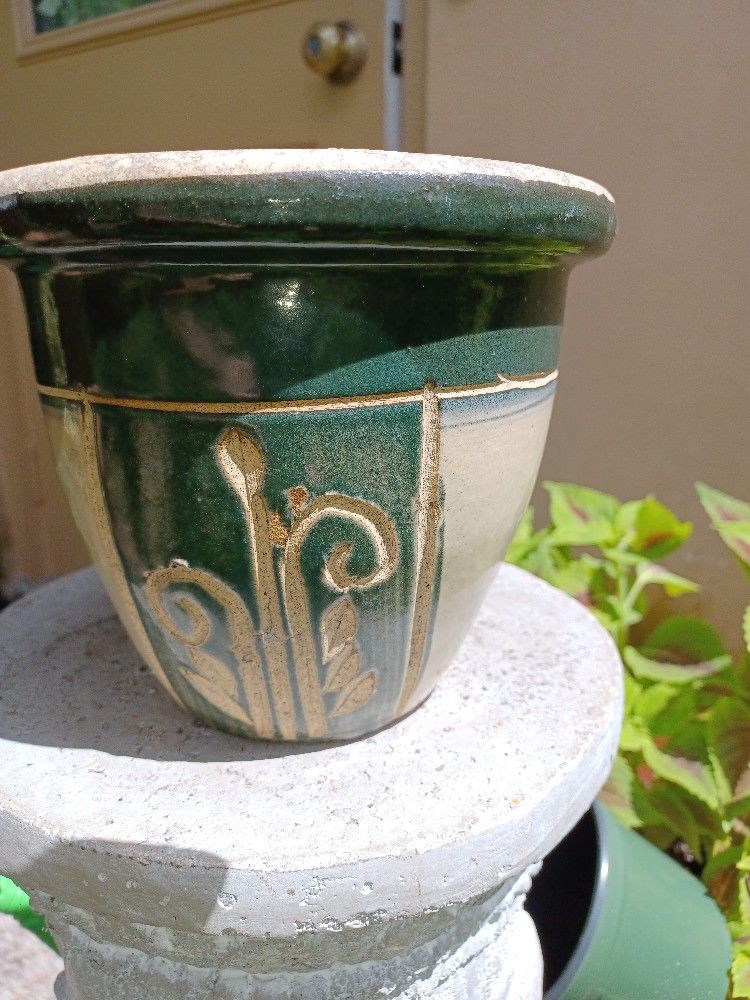 Heavy gauge ceramic vintage pot with beautiful design on one side with drainage hole measures 6 1/2 in wide 5 and a half in tall. Excellent condition no chips cracks glued or broken pieces. I have lots of other awesome ceramic clay and plastic pots both new and vintage as well as a tremendous selection of tropical plants for inside your home or your landscape. I'm a horticulturist. Please check my offers make a wish list and you're welcome to visit my tropical home Garden jungle.