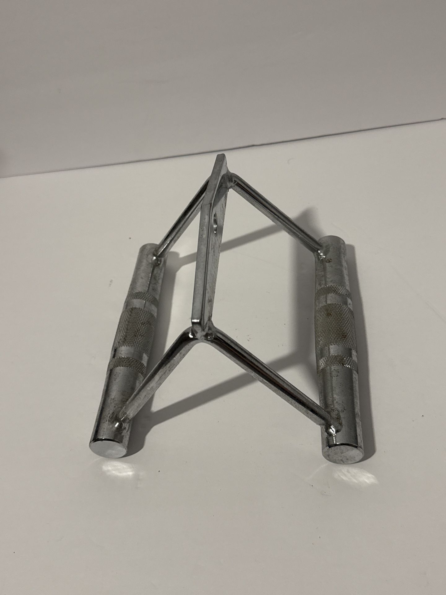 Selling a solid steel close-grip row handle — great for back workouts. Works with any cable machine (home gym or commercial setup). Uses: • Seated rows • Close-grip lat pulldowns • T-bar rows (with landmine) • Triceps pushdowns • Biceps cable curls • Multi-grip cable work Features: • Heavy-duty steel • Knurled grips for better hold • Standard cable attachment hole • Perfect for back, lats, and arm isolation • Some cosmetic wear (normal), fully functional