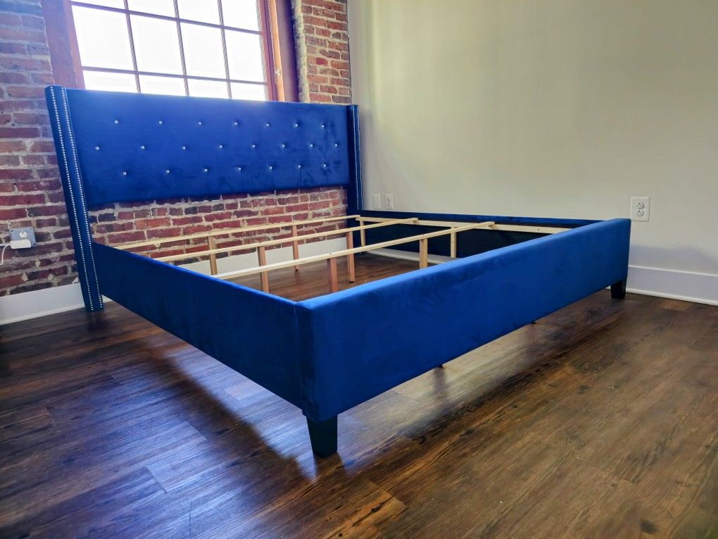 Velvet King platform bedframe. Available in Blue and Black! Features jewel tufting and nailhead trim. Includes: headboard, footboard, siderails and slats. Comes BRAND NEW in boxes!