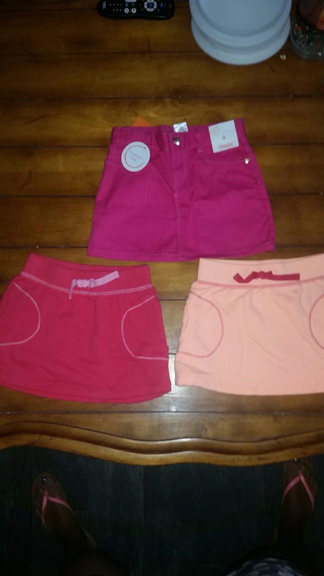 All are new with tags attached. The pink denim skirt is made by Gymboree and it's a size 4. The other two skirts are a cotton polyester blend with pockets one is pink & the the other is neon orange. Those two skirts are from Crazy 8. All three for $14. #OU42
