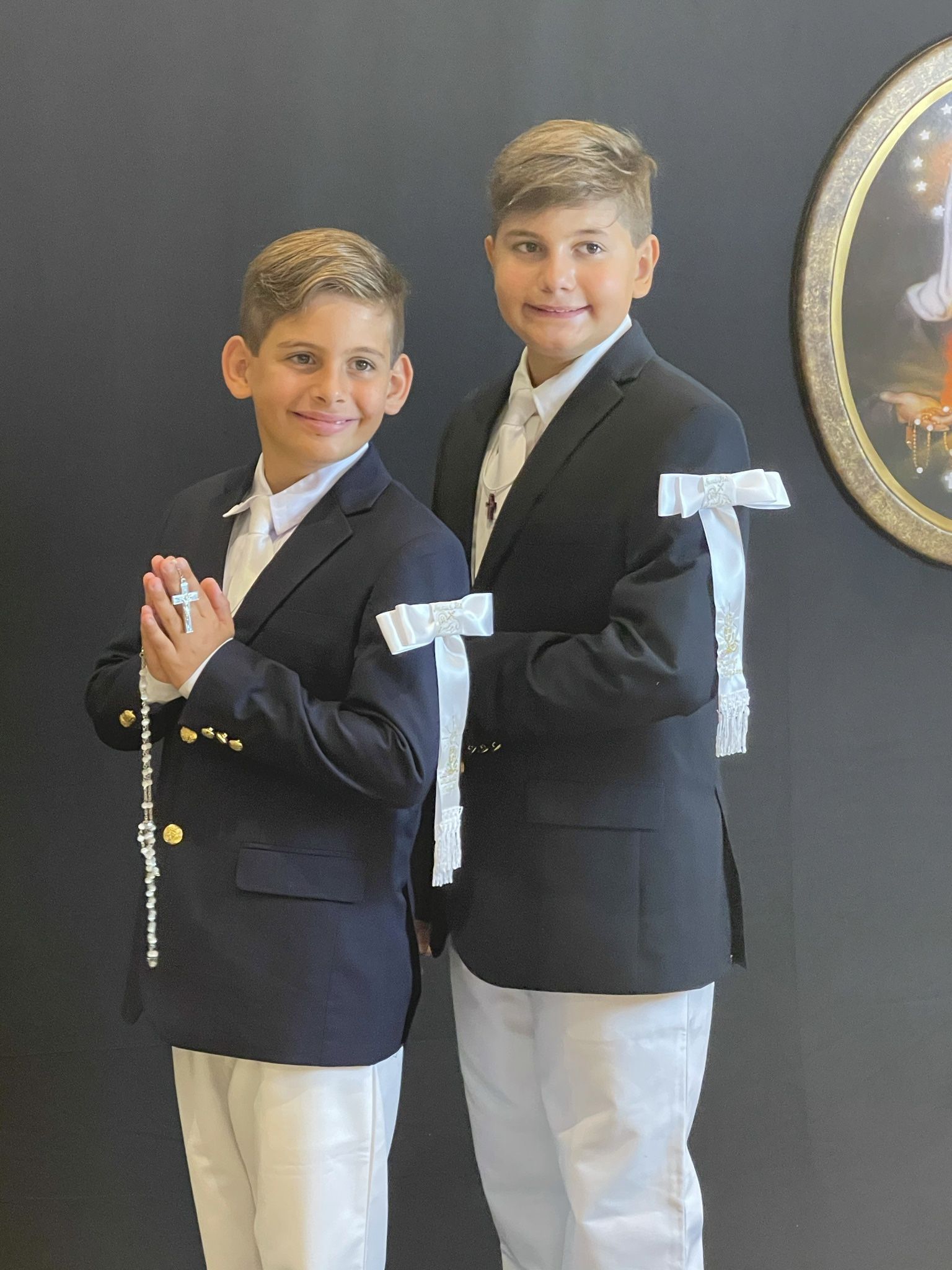 First communion outfit $45 each set ( I does not include navy blue blazer). Only one blazer $15 extra Sizes are 12 and 14. Worn once