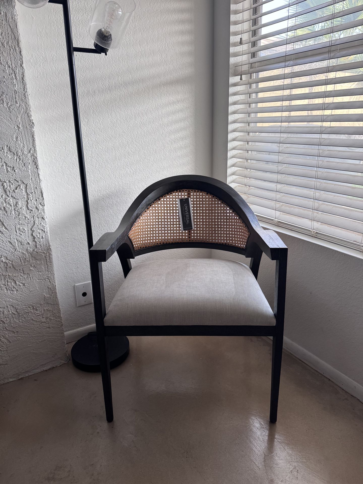 Upgrade your living space with this gorgeous "Dexter" accent chair by Universal Furniture. This piece perfectly blends Mid-Century Modern style with a touch of organic texture. It is currently fully assembled and has never been used. Highlights: • Design: Elegant Onyx (black) wood frame paired with a trendy Sorrell cane back. • Comfort: Plush, neutral-toned seat cushion that fits any decor. • Condition: Brand New with tags still attached. No scratches, stains, or wear. • Build: High-quality craftsmanship from a premium furniture brand (Universal). Dimensions: [Insert Width] x [Insert Depth] x [Insert Height]
