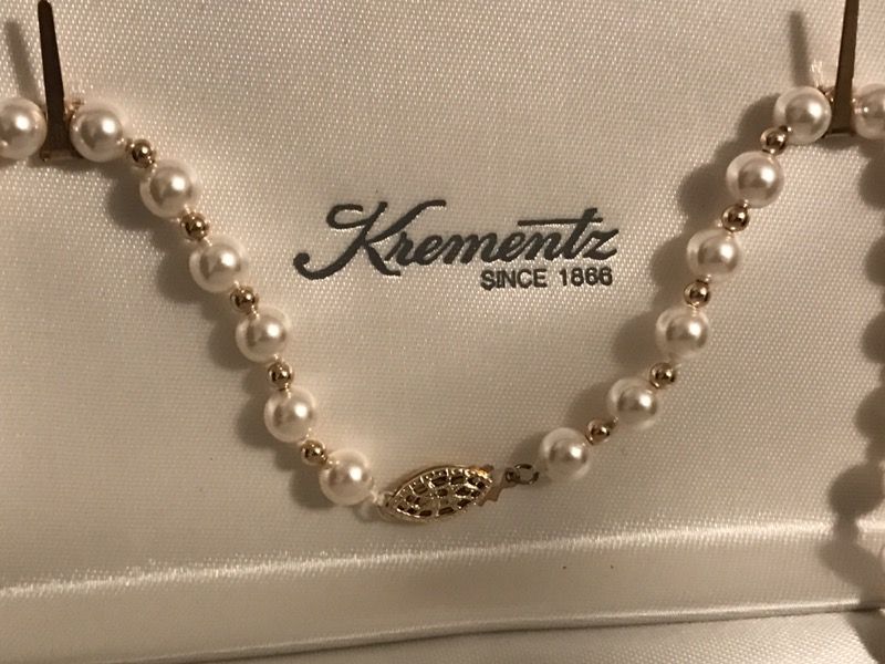 Beautiful, never worn, in original box vintage pearl necklace. Krementz is a jewelry company well known for its simplicity and elegance. The gold clasp is 14/20 gold filled and unsure if the pearls are real or faux. Worn, the necklace is 9" long.