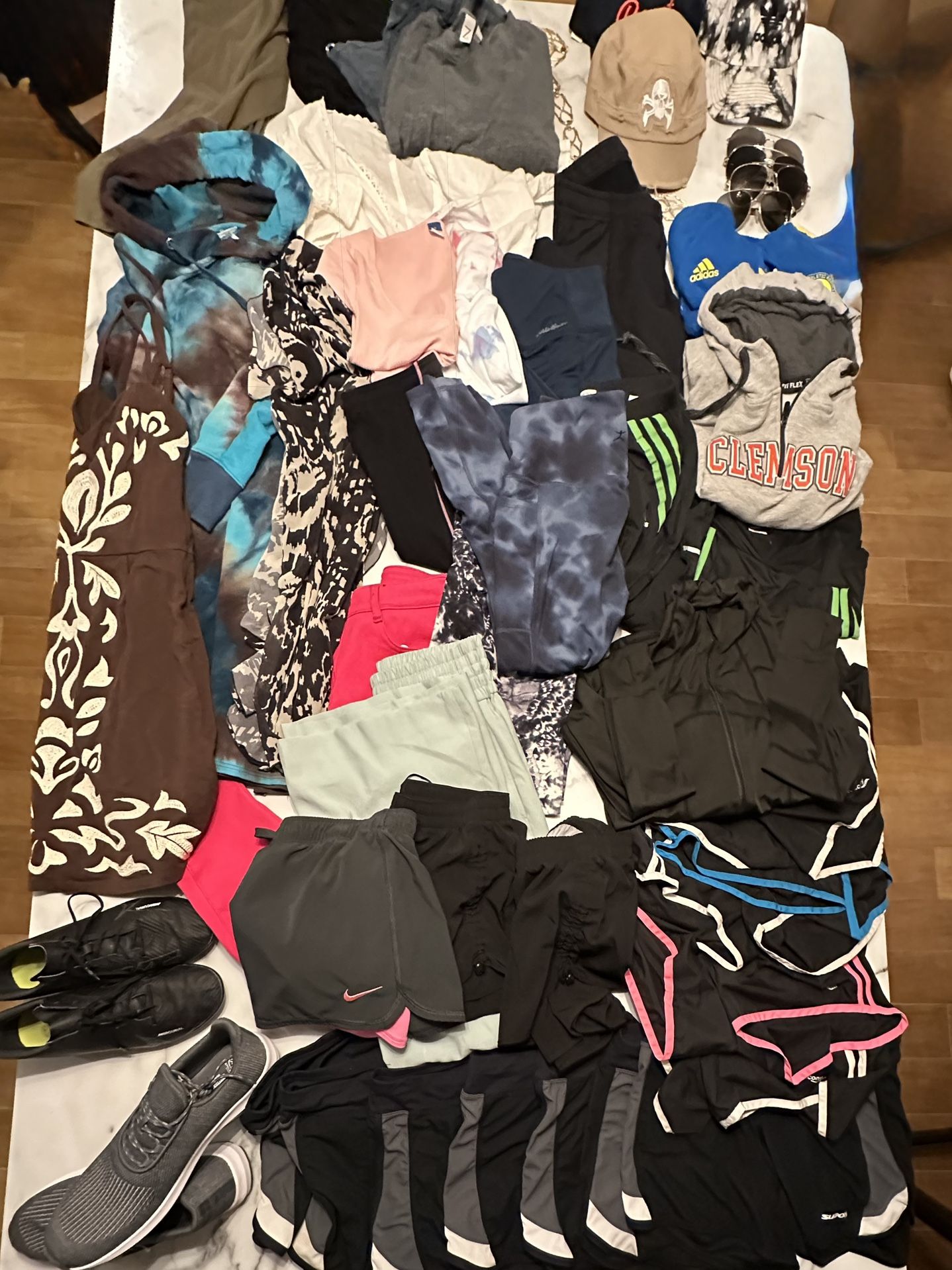 Women’s clothing lot - size small - 7 pairs Sugoi athletic shorts - 5 pairs Saucony athletic shorts - 1 pair Nike athletic shorts - 2 pairs Athleta running shorts - 2 pairs pants - pink denim fleece lined and seafoam green wide legged - 2 athletic jackets - 1 is black, 1 is Adidas royal blue - Adidas running tights and tank - black with green stripes - Clemson hoodie - 4 athletic leggings - 3 regular length Eddie Baue, Sugoi (fleece lined), blue Danski. Diamon dye look, 2 cropped CE-X, and Calvin Klein B&W - 4 aviator sunglasses - 1 gold chain belt - 3 baseball caps - 2 long sleeved shirts (Zella, Athleta), Cable & Gauge - 1 bodycon army green long sleeve dress - 1 tie dye hooded dress/cover - 1 sleeveless ruffle front dress - 1 brown/embroidery tank dress FREE if they’re your size & you’d like: 1 new with tags grey memory foam athletic shoes - size 10 and 1 Nike Mercurial cleats size 10 women/size 9 men