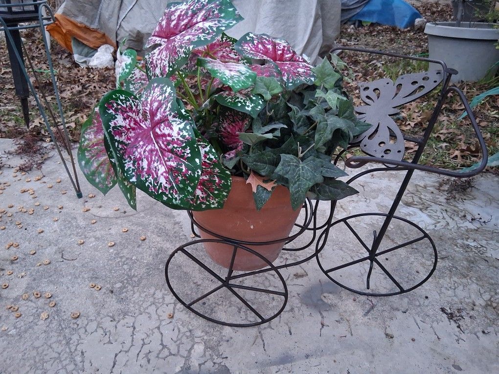 Metal wire frame planter, trike shape with faux greenery and metal butterfly in LG clay pot..