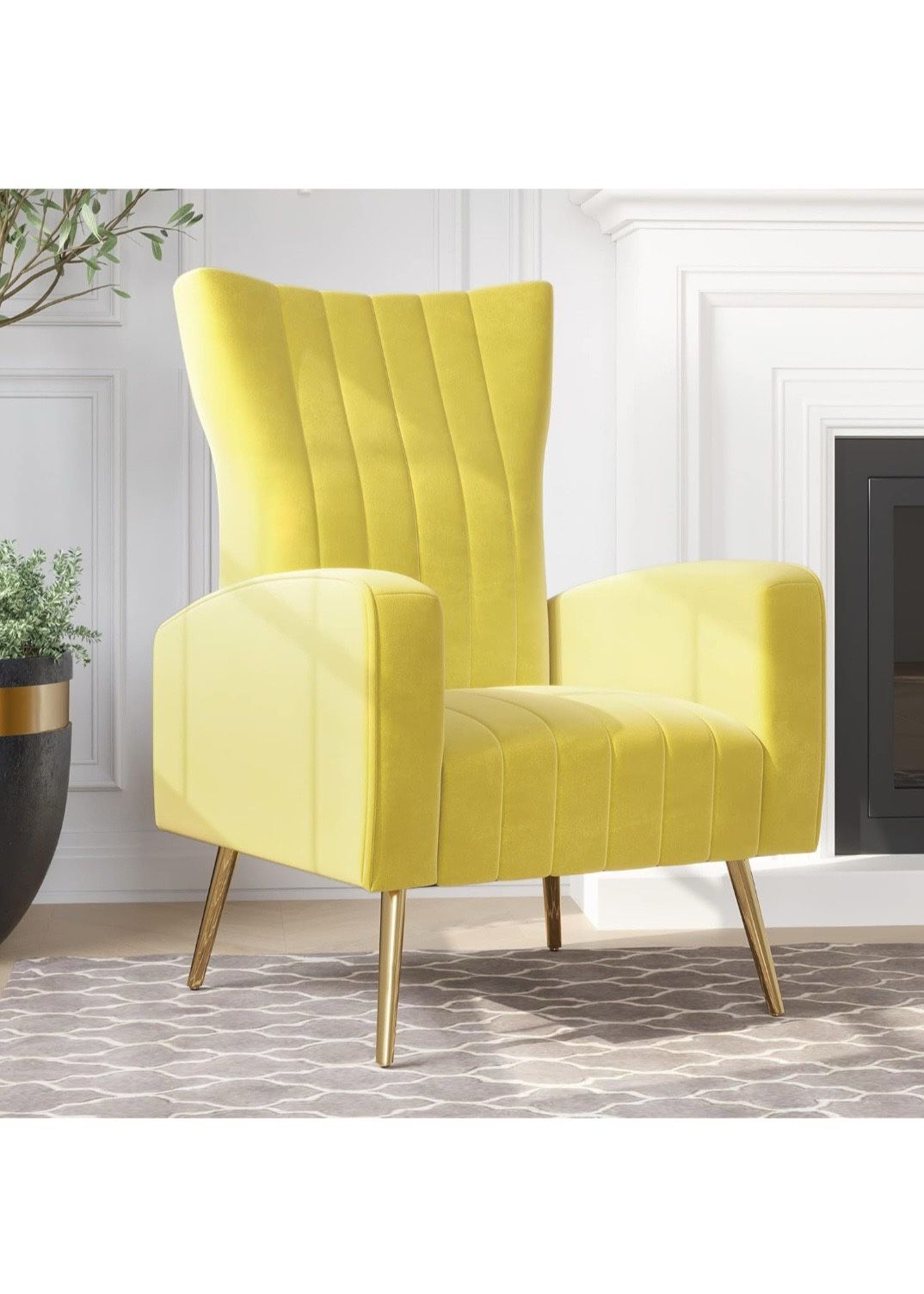 F543 $115 Velvet Accent Chairs for Living Room, Modern Wingback Vanity Chair Upholstered Arm Chair High Back Accent Chair with Metal Legs, Armrests for Living Room Bedroom- Kinsley (Yellow) [MODERN & CHIC DESIGN] Showcases the in-style mid-century modern design. An eye-catching accent chair with a classic wingback silhouette and four tapered and splayed brushed gold legs. [LUXURY VELVET UPHOLESTRY] Clothed in soft velvet upholstery with vertical channel detailing for a dash of glamor and luxury. The bright yellow upholstery adds a nice dollop of color to your decor. [EROGONMIC CHAIR] Wide back design supports your spine, relieving pressure and fatigue, while the curved armrests and high-density sponge provide excellent support, offering hours of comfortable seating. [STRUDY CONSTRUCTION] Solid wood frame and metal legs offer long-lasting durability. Fitted with antiskid pads to enhance stability and prevent damage to floors.