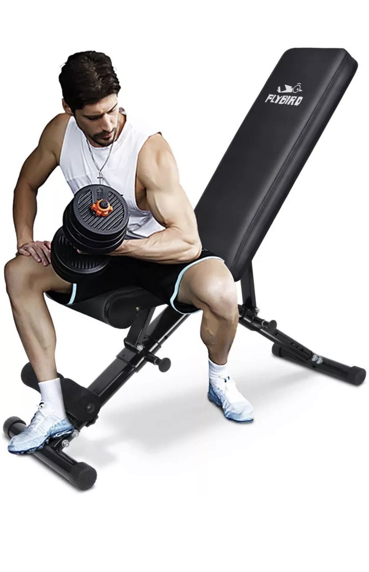 B23 $90 FLYBIRD Multifunctional Dumbbell Bench New About this item 【FLYBIRD】Design and produce fitness equipment for 20 years. Especially in WEIGHT BENCH, the bench was designed with advice of professional coach. You need a durable bench, Not a one month bench. 【2021 High Quality Bench】Made of commercial thickness steel, past thousands of weight test to ensure safety for workout everytime, Not the mendacious bench. 【Weight capacity is 800 pounds】; Designed a unique frame with triangular structure and made of heavy duty commercial quality steel which is very sturdy and durable; All this is important in your workout 【Fast adjustment with automatic lock】; Designed with 7 back positions and 3 seat positions for full body workout; You just pull the fast bolt, adjust the place which fit yourself and automatic lock 【Good 2 inch soft foam padding】; 10.6 inch upgraded backrest and seat made of pu leather and filled with soft foam padding; Allow you do any exercise with a very comfortable feeling 【Save 80 percent space】; FLYBIRD foldable bench, easy to carry and no assembly needed, folded size 30 inch long 16 inch wide 9 inch high; You can put it in the corner or under the bed when you finish workout