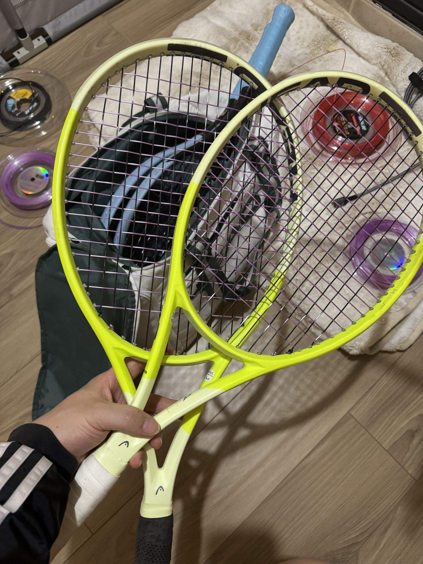 Head Extreme Pro for $170 each. Willing to sell both for $320 ($160 each) 4 3/8 grip size Polytour Spin on mains Toroline Snapper on cross 52/50 tension. Last strung in October