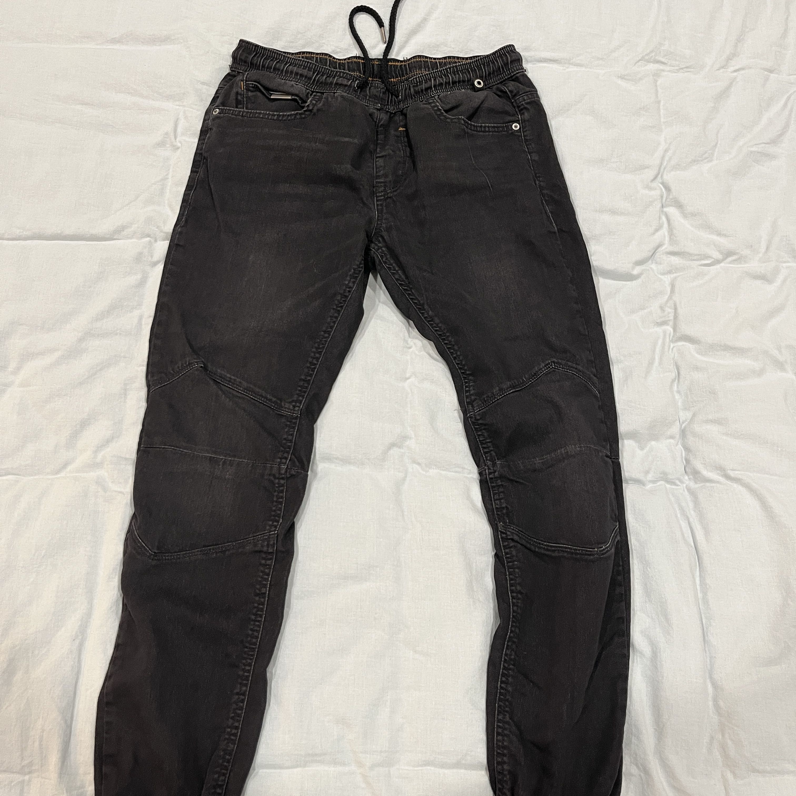 Black denim pants with elastic waistband, drawstring closure, and reinforced knee panels. Jogger-style with tapered leg design. Medium Size