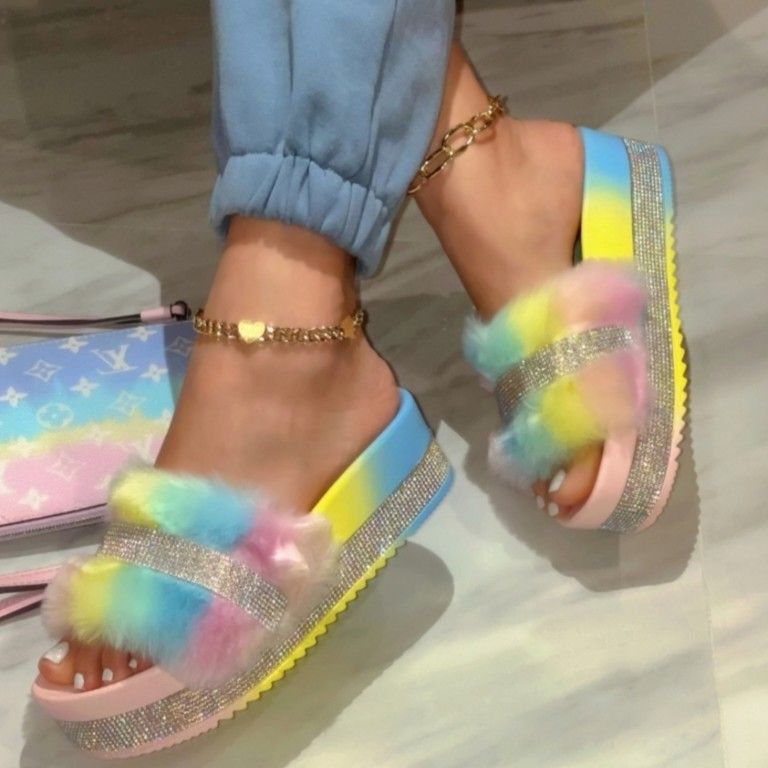 Sizes 5.5, 6.5, 7 , 7.5 ,8,9 &10 low stock FUR SLIDES - MULTI PRICE FIRM TRUE TO SIZE NO HOLDS SIZE & FIT Man made material Easy on and off Approx 2” platform Diamond details