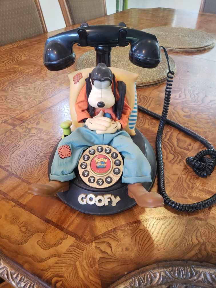 Vintage Disney Goofy telephone by Telemania. Features Goofy sitting back in a chair with the handset perched above, keypad styled with a Toon Disney button, and “Goofy” nameplate at the base. Pick up from Porter Ranch Ca 91326